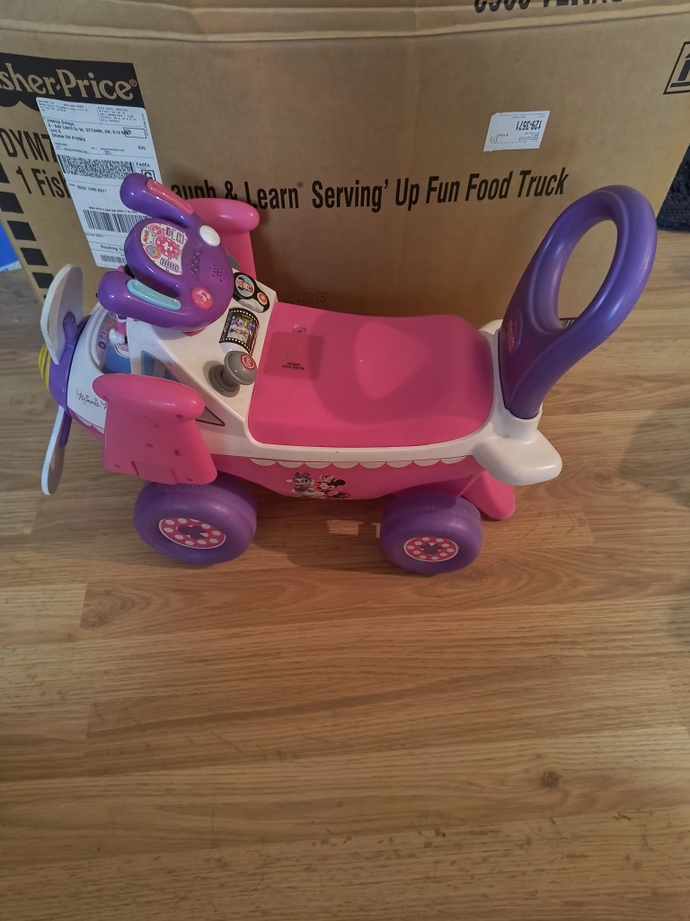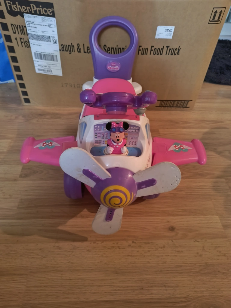 Minnie Mouse themed ride-on airplane toy.