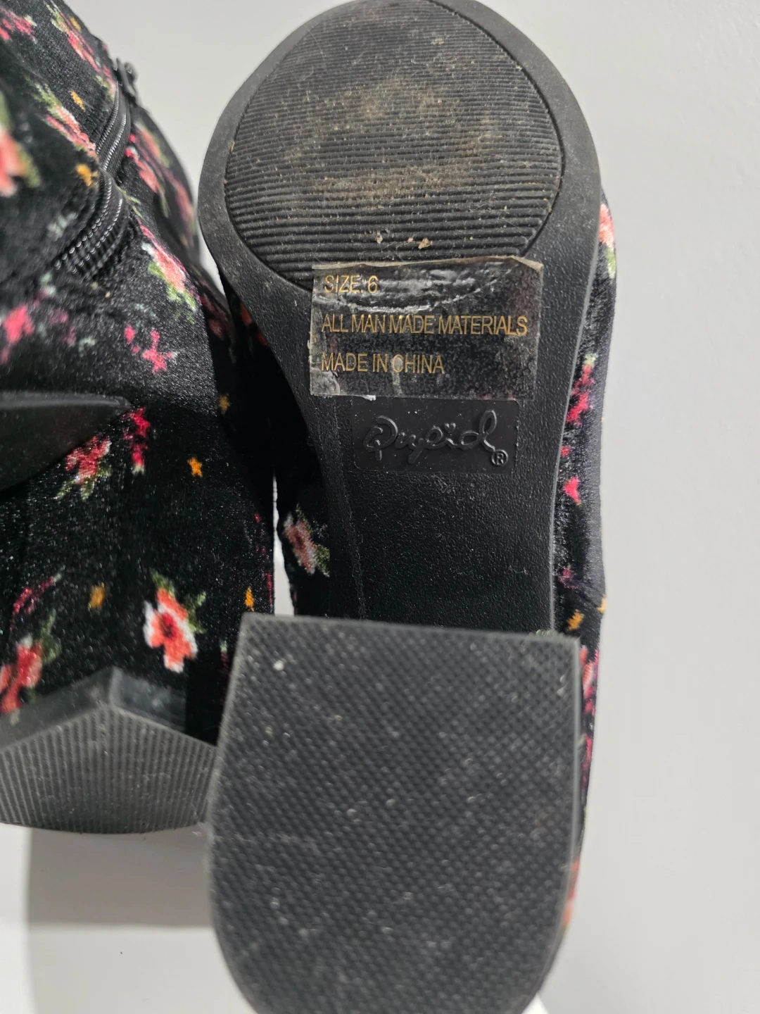 Black velvet ankle boots with a colourful floral print. It's a size 6, made with all man-made materials. These boots zip up the side.