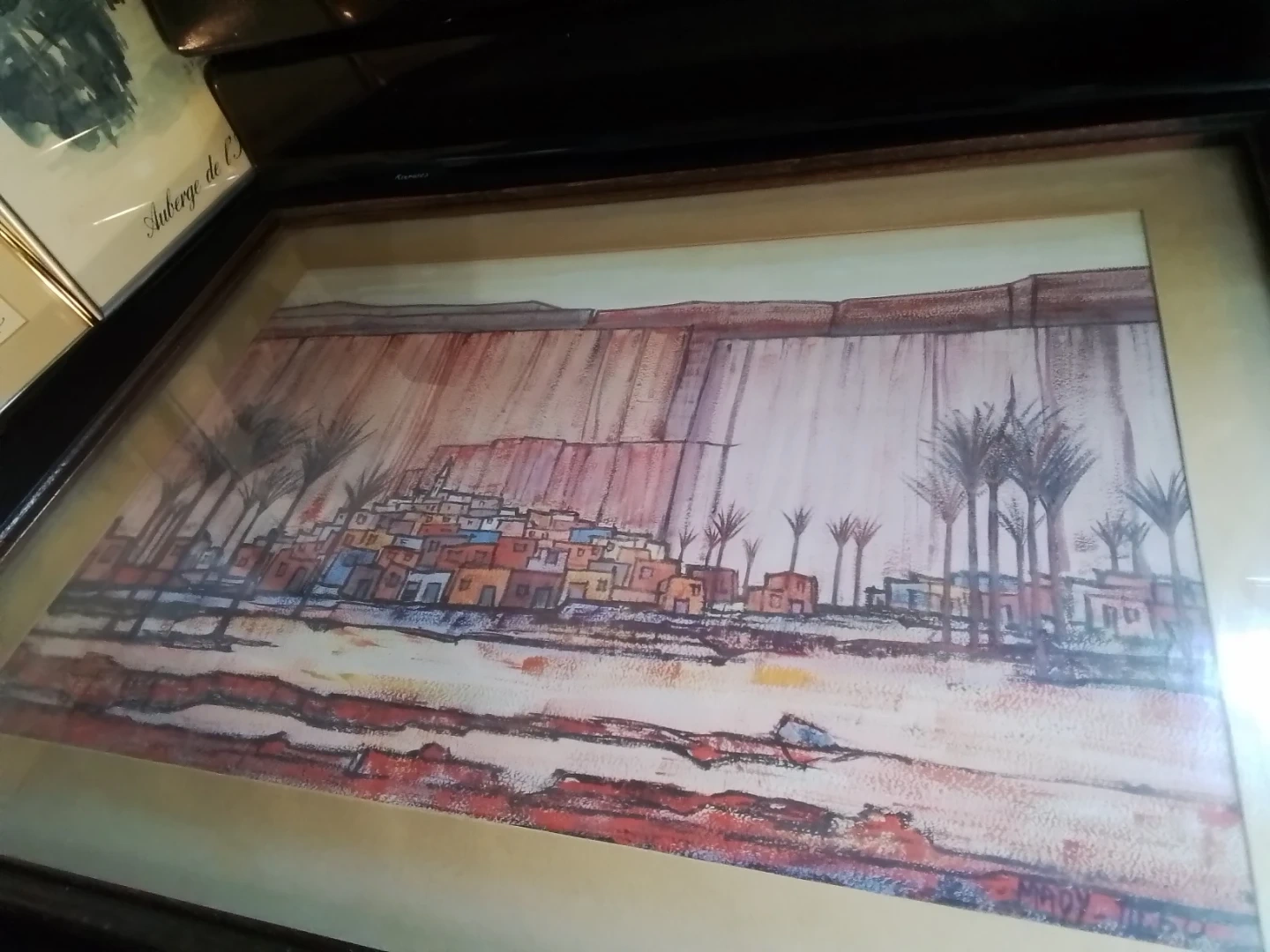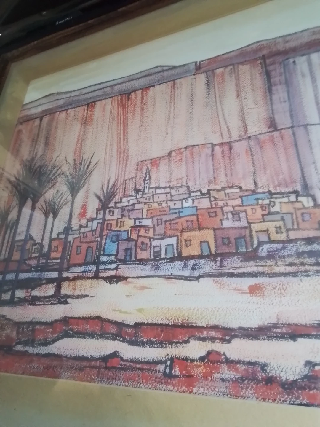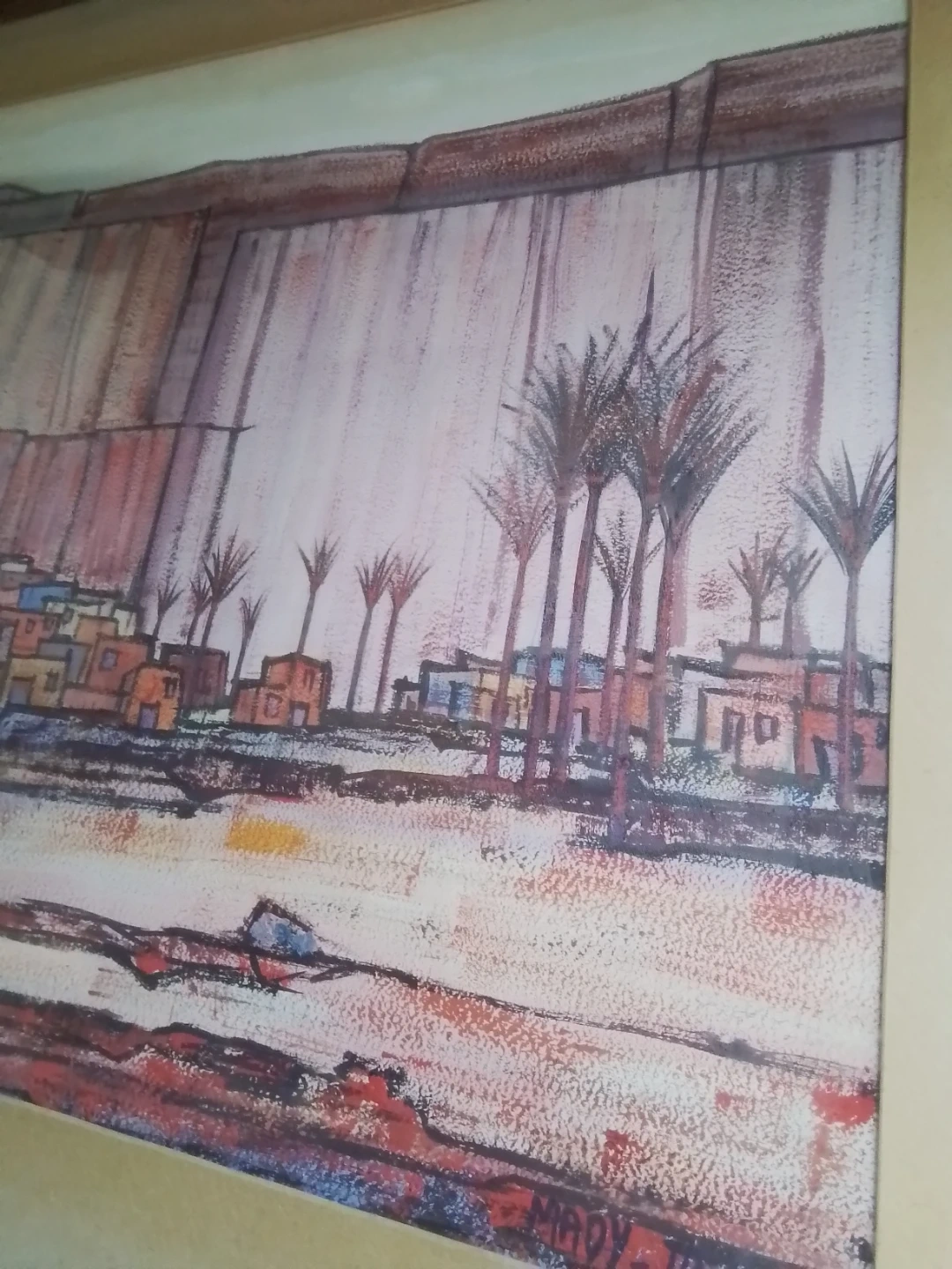 This is a framed painting by Mady Tosto depicting a desert town scene with palm trees. It's matted and framed, ready to hang. The artwork has a unique abstract style.