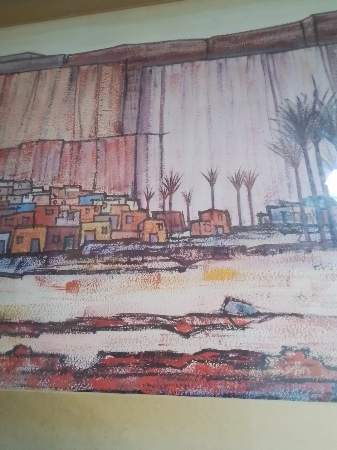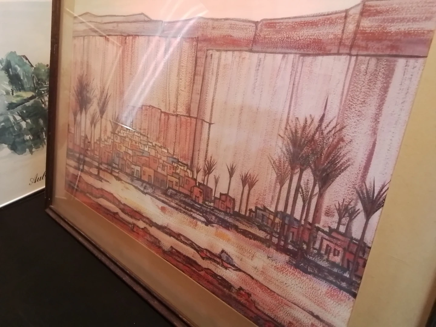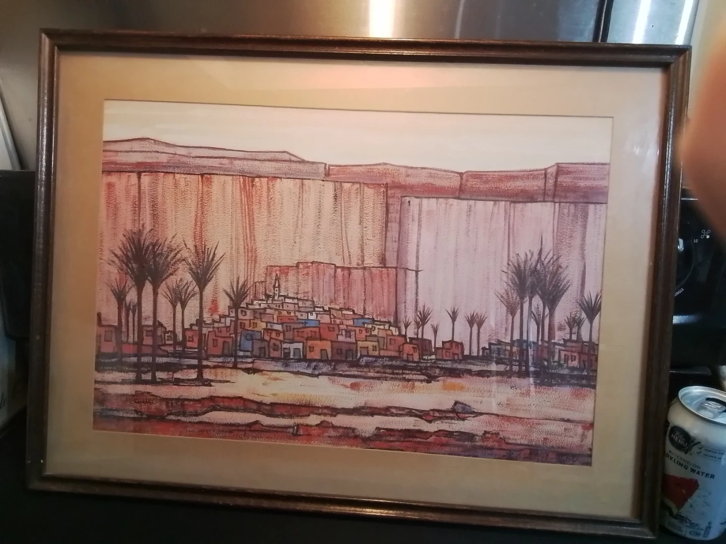This is a framed painting by Mady Tosto depicting a desert town scene with palm trees. It's matted and framed, ready to hang. The artwork has a unique abstract style.