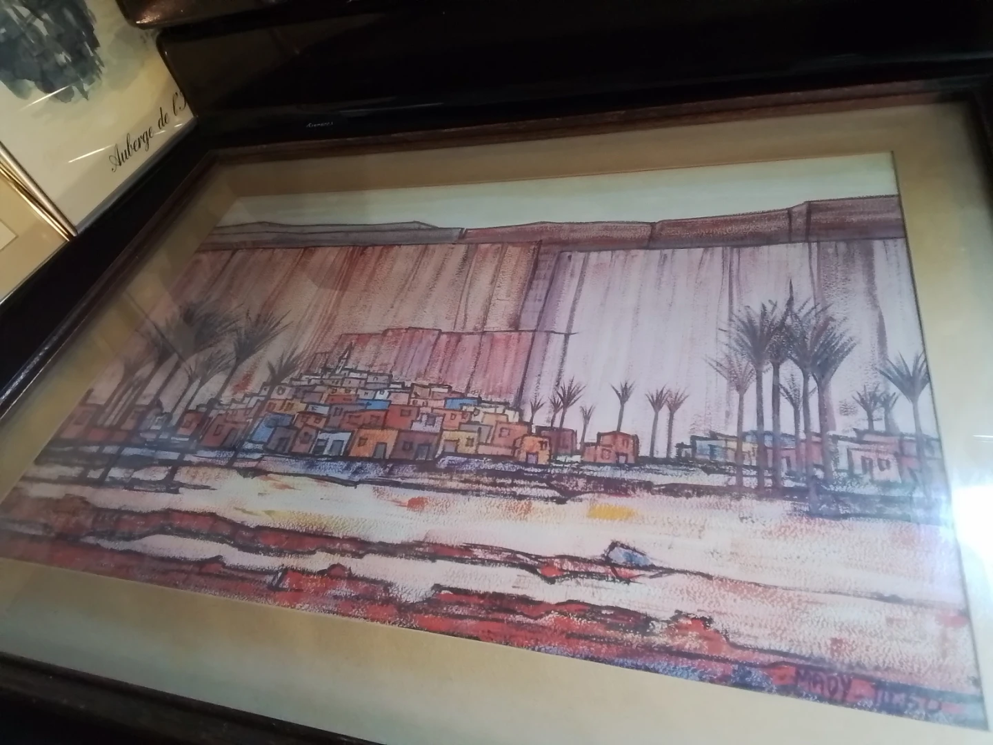 This is a framed painting by Mady Tosto depicting a desert town scene with palm trees. It's matted and framed, ready to hang. The artwork has a unique abstract style.