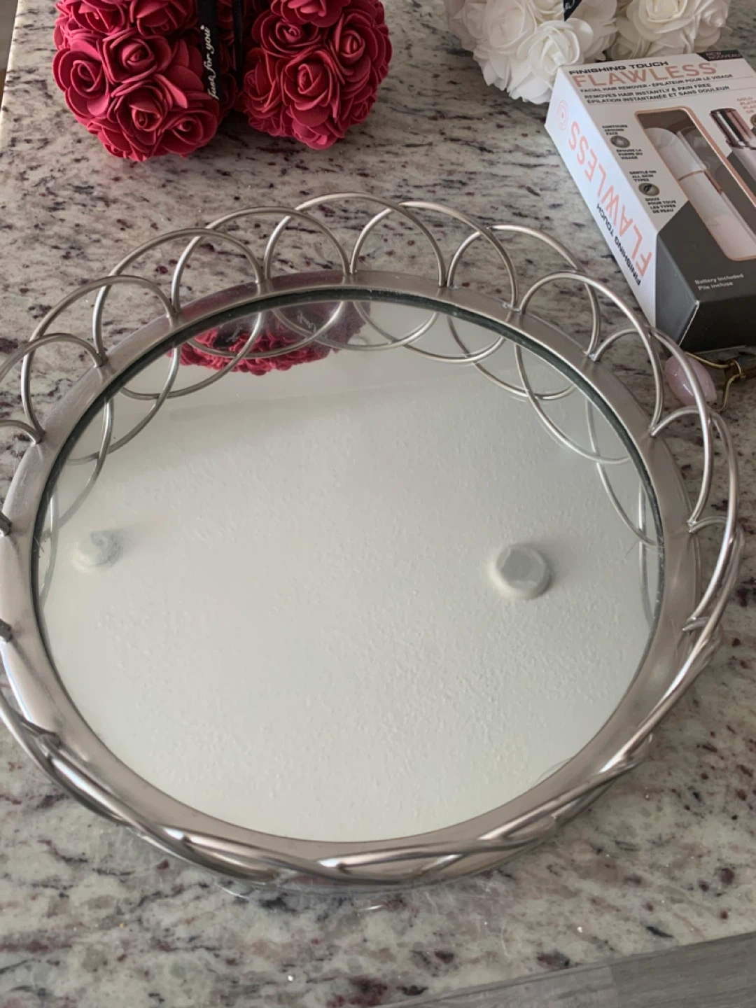 This decorative tray features a mirrored surface and an ornate silver-tone border with a repeating circular design. It's approximately 12 inches in diameter, perfect for displaying candles or small decorative items. Use it as a centrepiece or on a vanity.