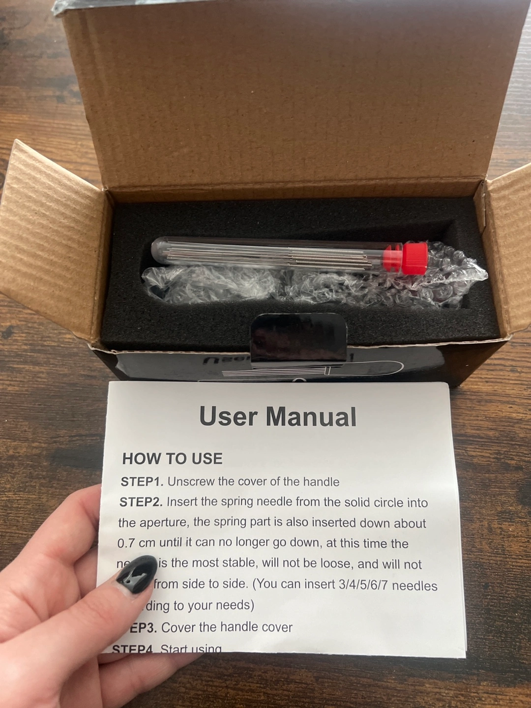 This tool comes with multiple needles for espresso distribution. It includes a user manual with instructions on how to assemble and use it. The needles are stored in a clear tube with a red cap.