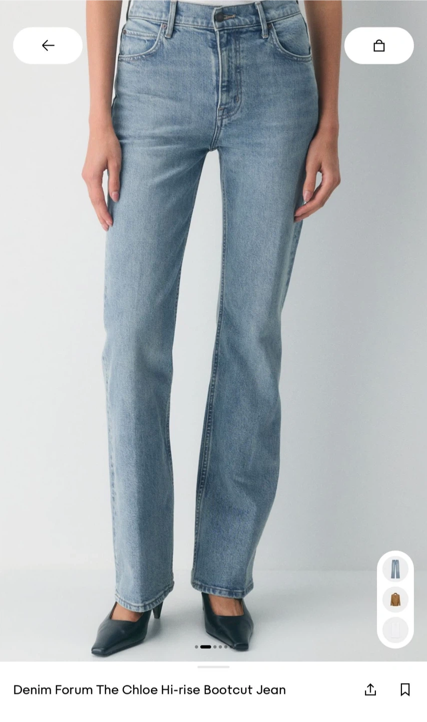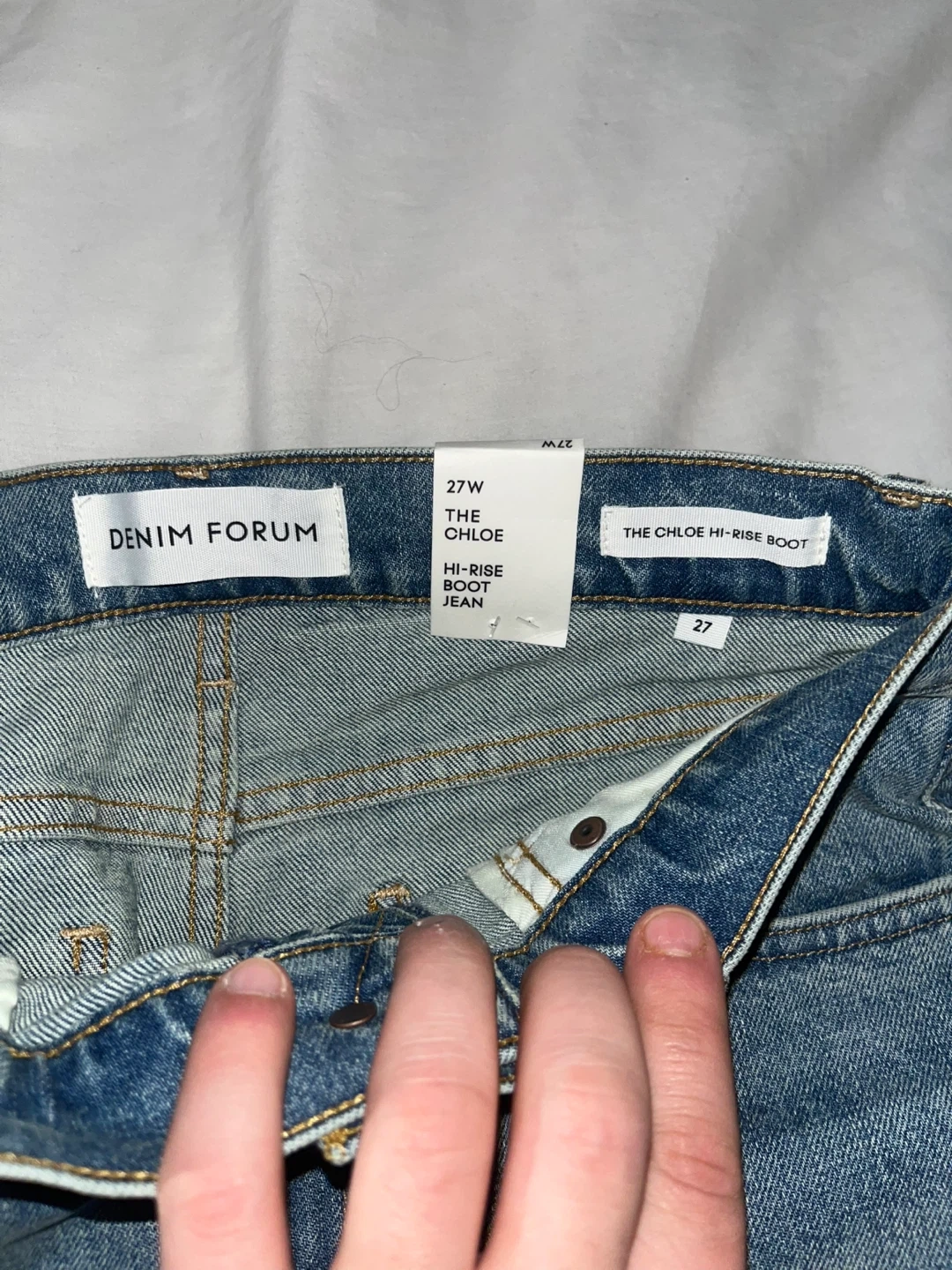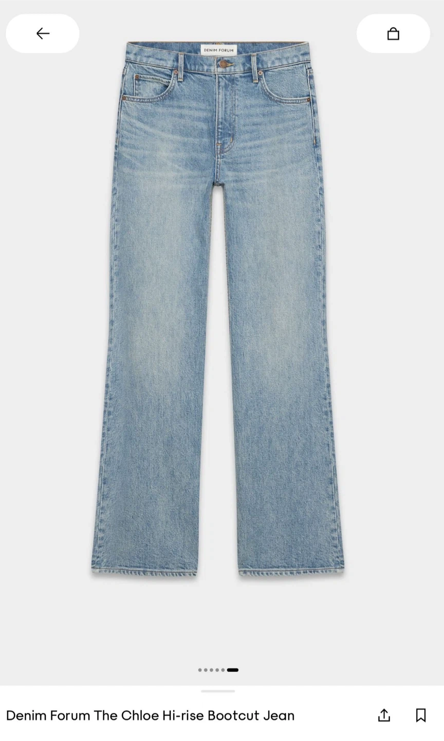 These are DENIM FORUM "The Chloe" hi-rise boot jeans. Made with a 27W waist size. They feature a classic blue denim wash.