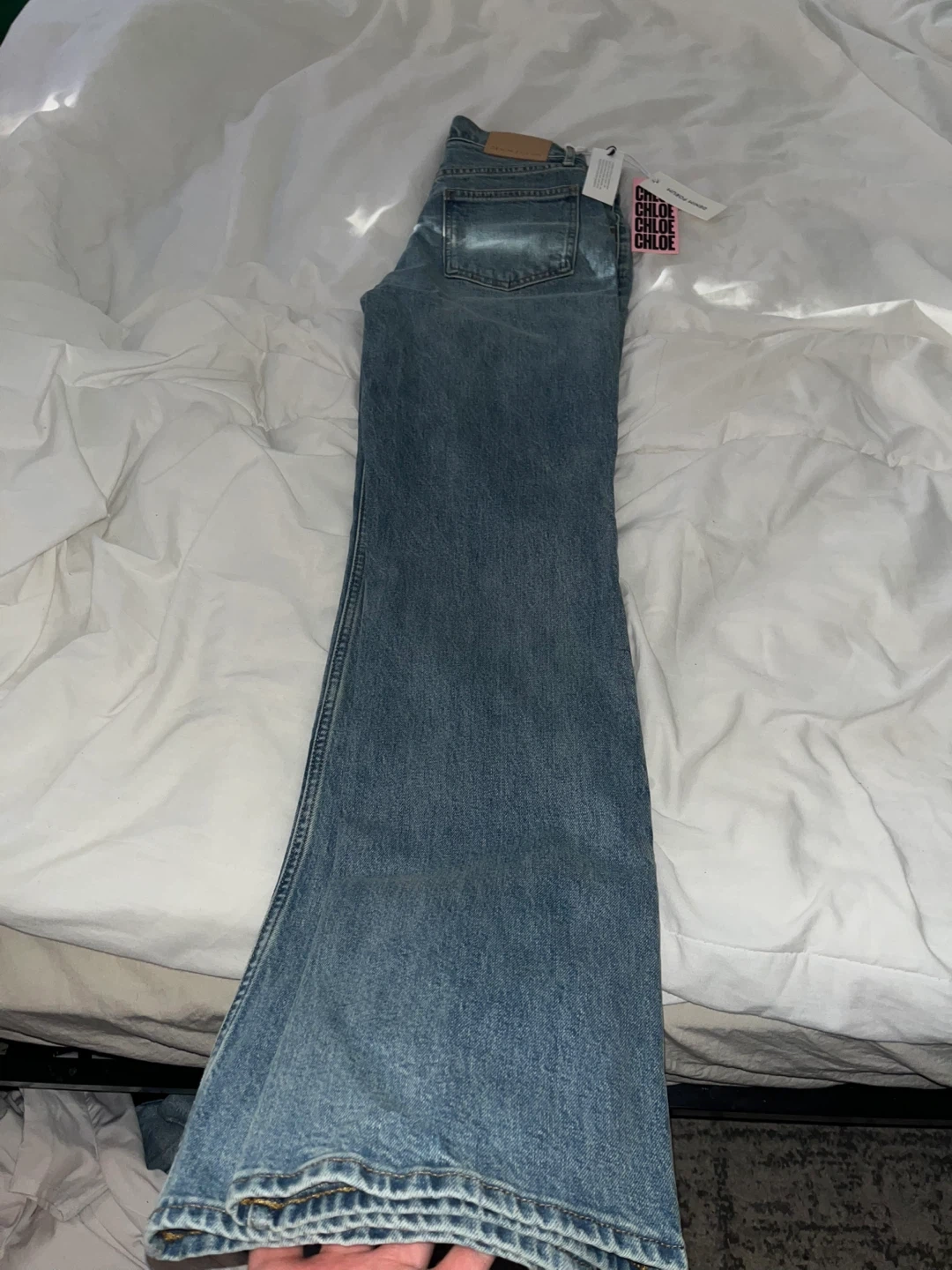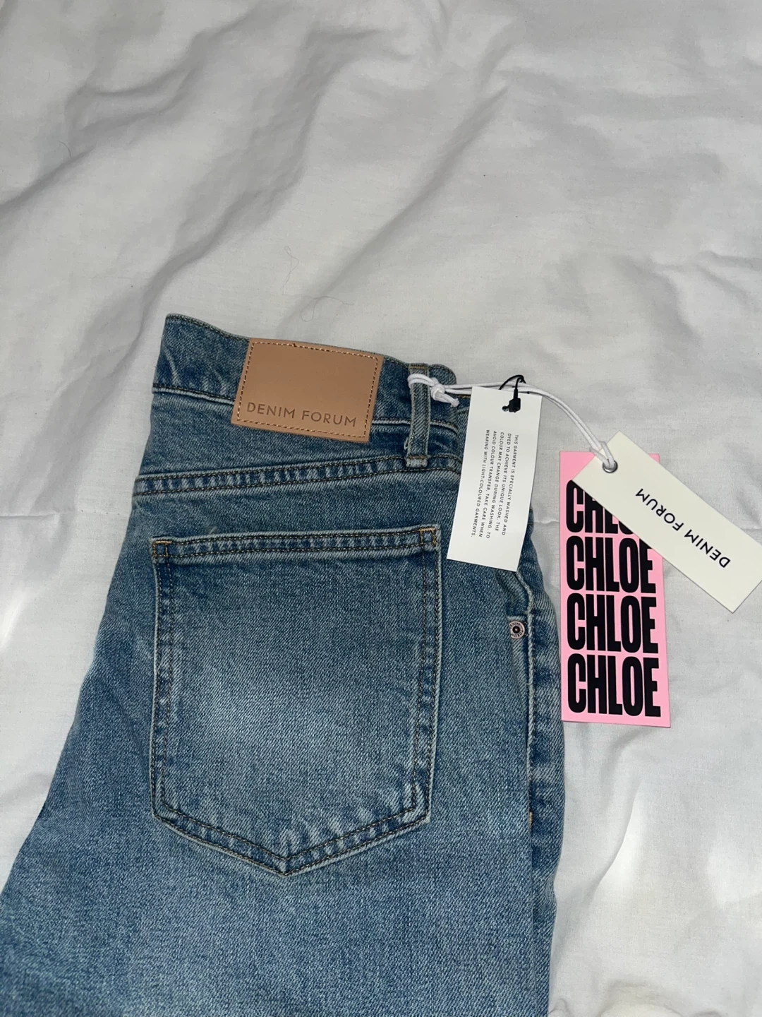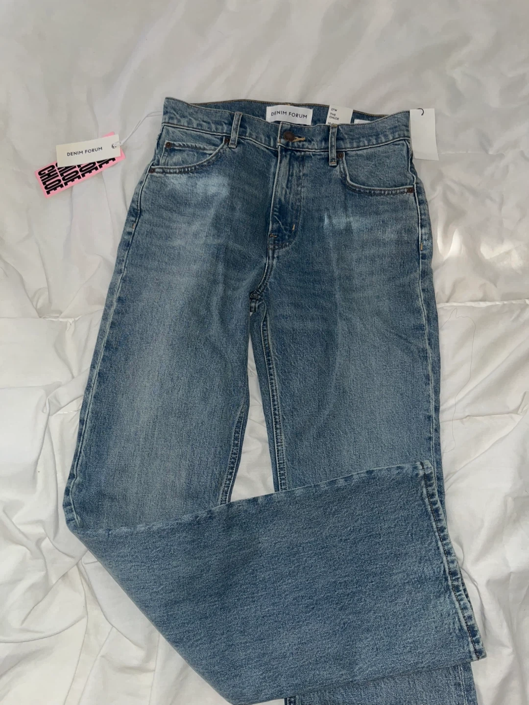 These are DENIM FORUM "The Chloe" hi-rise boot jeans. Made with a 27W waist size. They feature a classic blue denim wash.