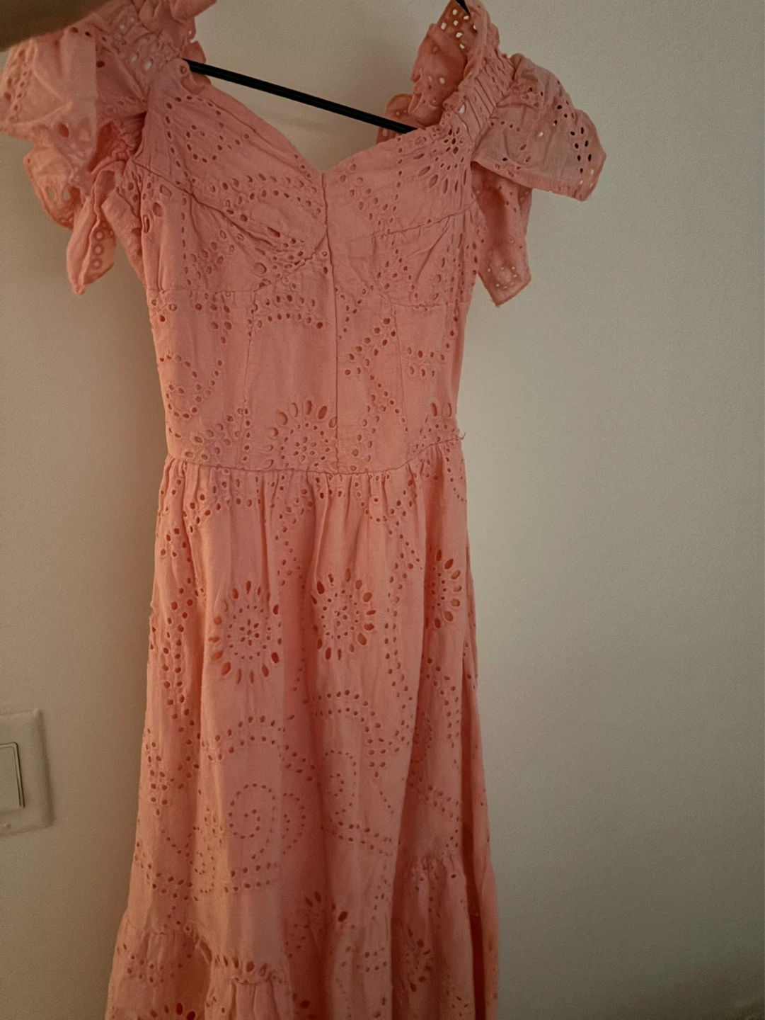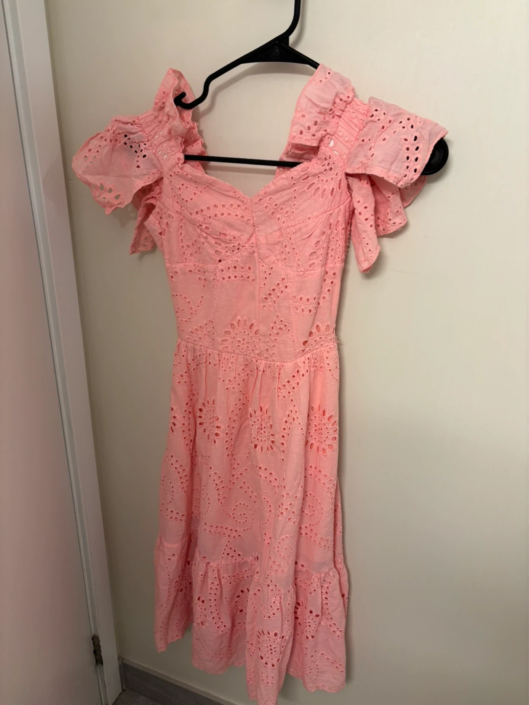 A beautiful pink midi dress with delicate broderie anglaise detailing throughout. It features ruffled off-the-shoulder sleeves and a flattering fit. Perfect for summer occasions!