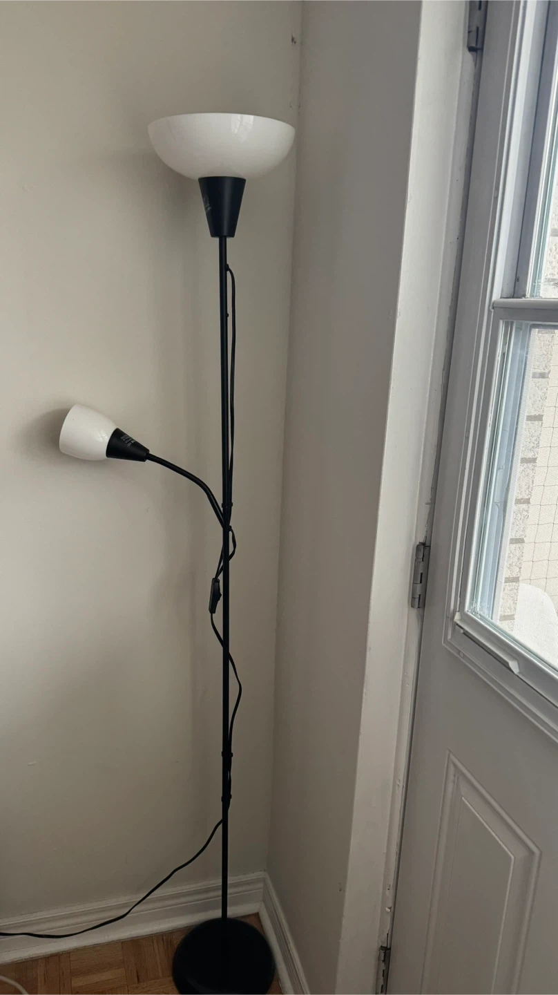 This black floor lamp has a main overhead light and a flexible reading light. It's a great option for living rooms or bedrooms. The lamp has a sturdy base and is fully functional.