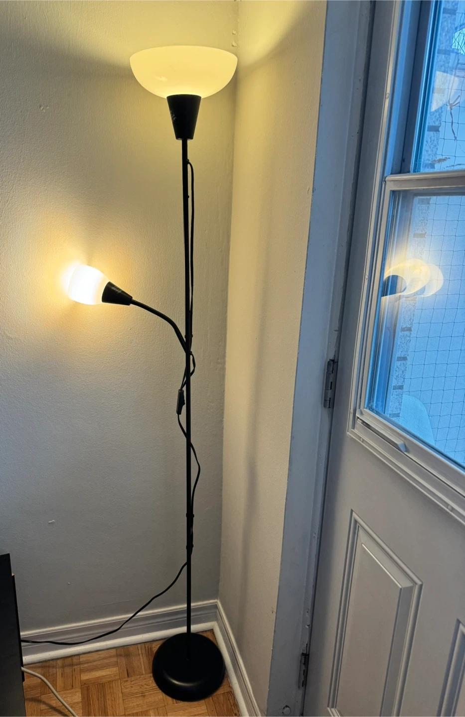 This black floor lamp has a main overhead light and a flexible reading light. It's a great option for living rooms or bedrooms. The lamp has a sturdy base and is fully functional.