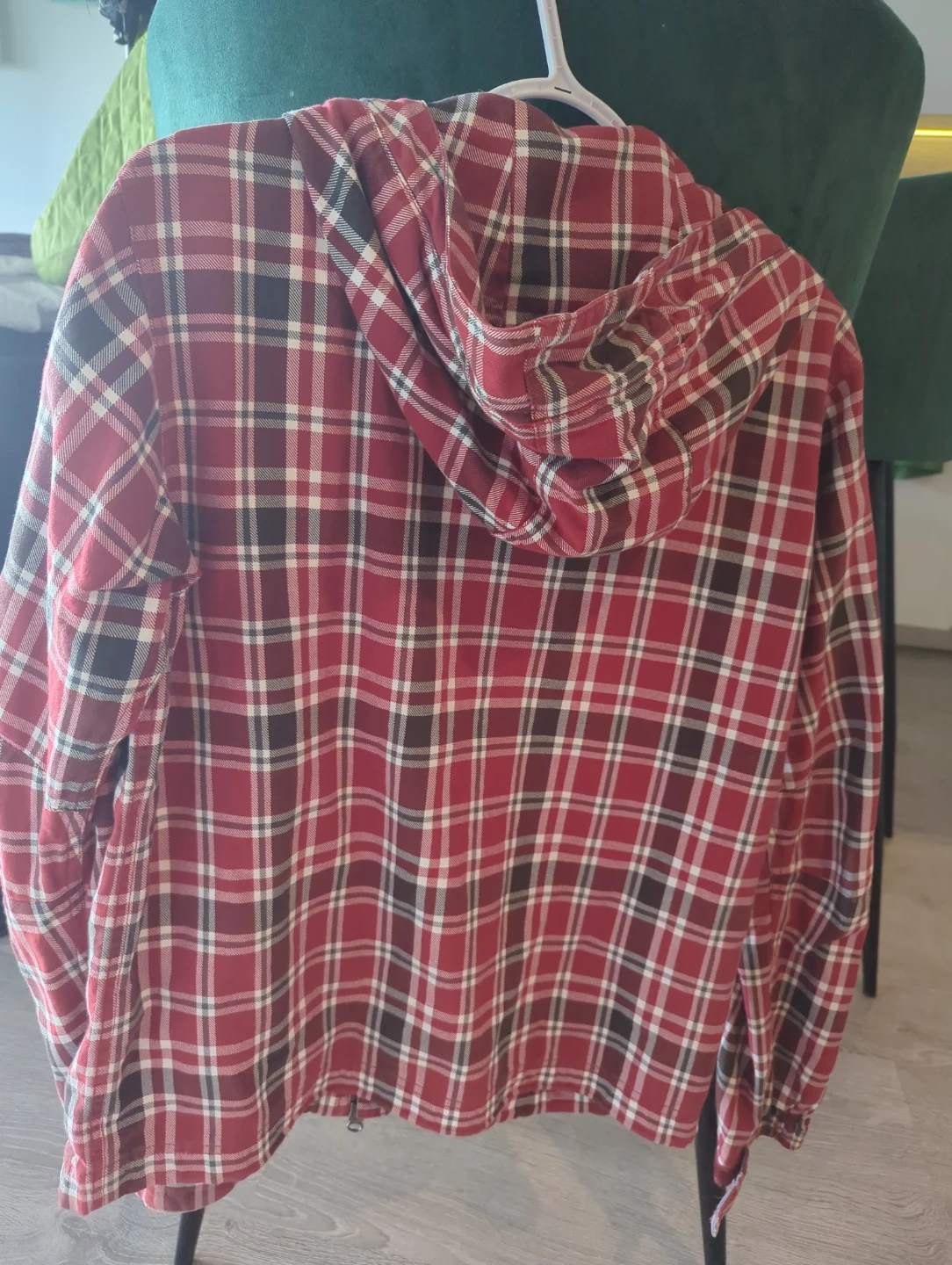 This Columbia hooded jacket features a classic red, white, and black plaid pattern. It has a full zip closure and zippered pockets. Made with comfortable, durable fabric.