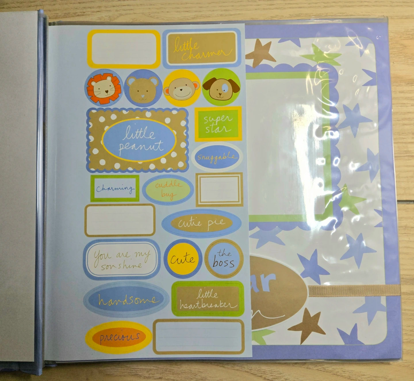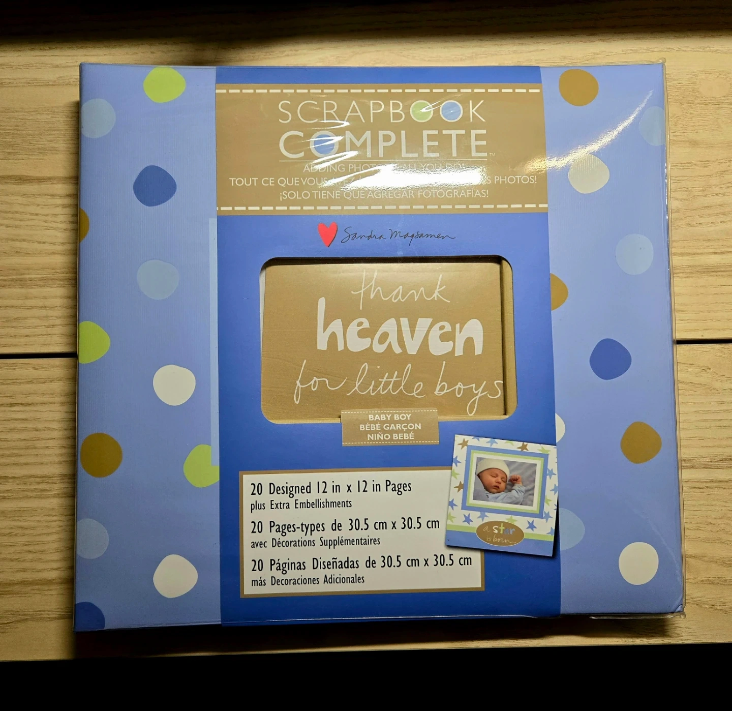 I'm selling a brand new scrapbook complete for a baby boy! It's 12x12 inches, with 20 designed pages and extra embellishments. Perfect for adding photos and decorations to create a memorable keepsake.