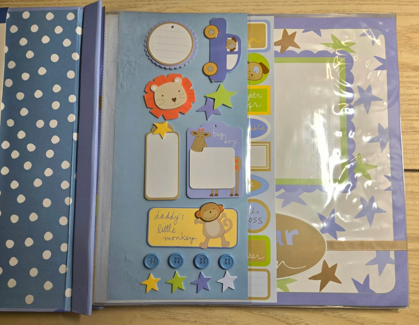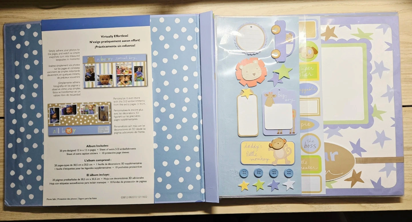 I'm selling a brand new scrapbook complete for a baby boy! It's 12x12 inches, with 20 designed pages and extra embellishments. Perfect for adding photos and decorations to create a memorable keepsake.