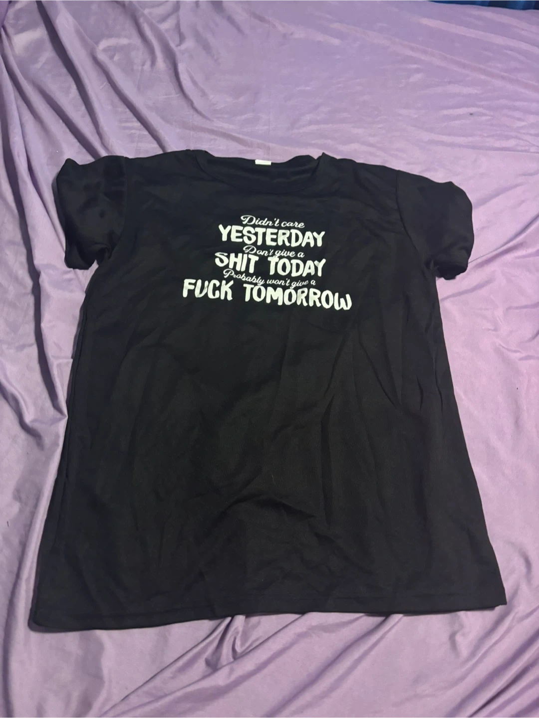 Black t-shirt with a graphic print that says "Didn't care YESTERDAY, Don't give a SHIT TODAY, Probably won't give a FUCK TOMORROW". Short sleeves and crew neck. Cotton blend material.