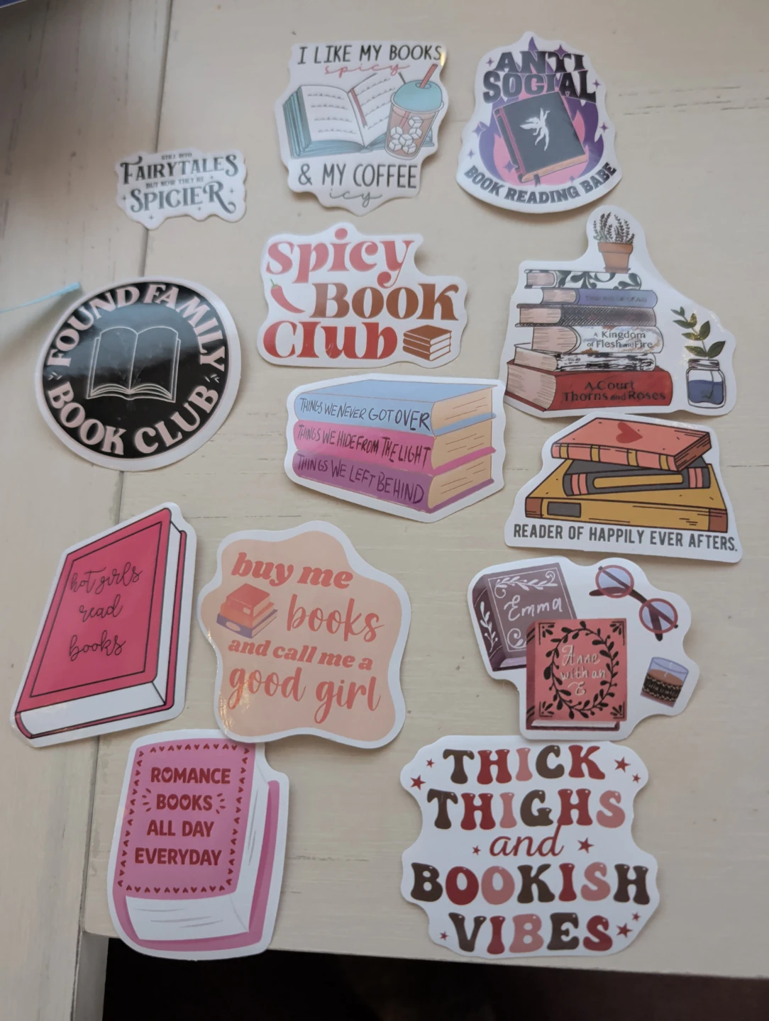 A collection of fun stickers for book lovers. Designs include phrases like 'Spicy Book Club,' 'Hot Girls Read Books,' and 'Thick Thighs and Bookish Vibes.' They're perfect for decorating laptops, water bottles, or journals.