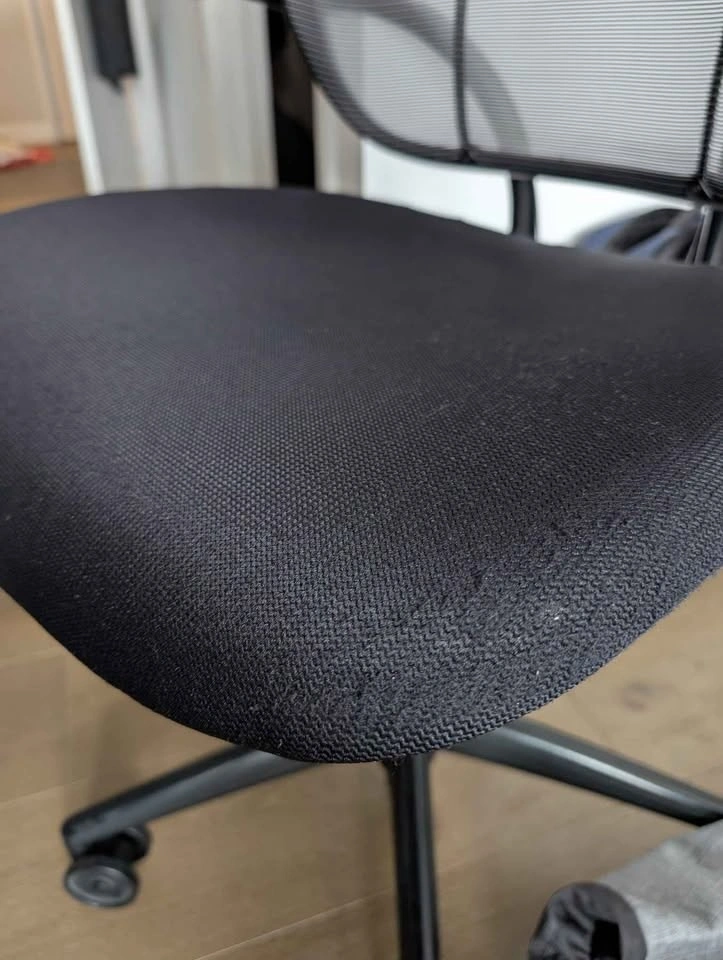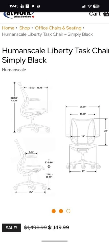 Ergonomic Humanscale Liberty Task Chair in black. Super comfy office chair with a mesh back. Great for long work days! Dimensions are about 38.5"-43.3" tall, seat height 17.7"-22.5" and overall width is 21".