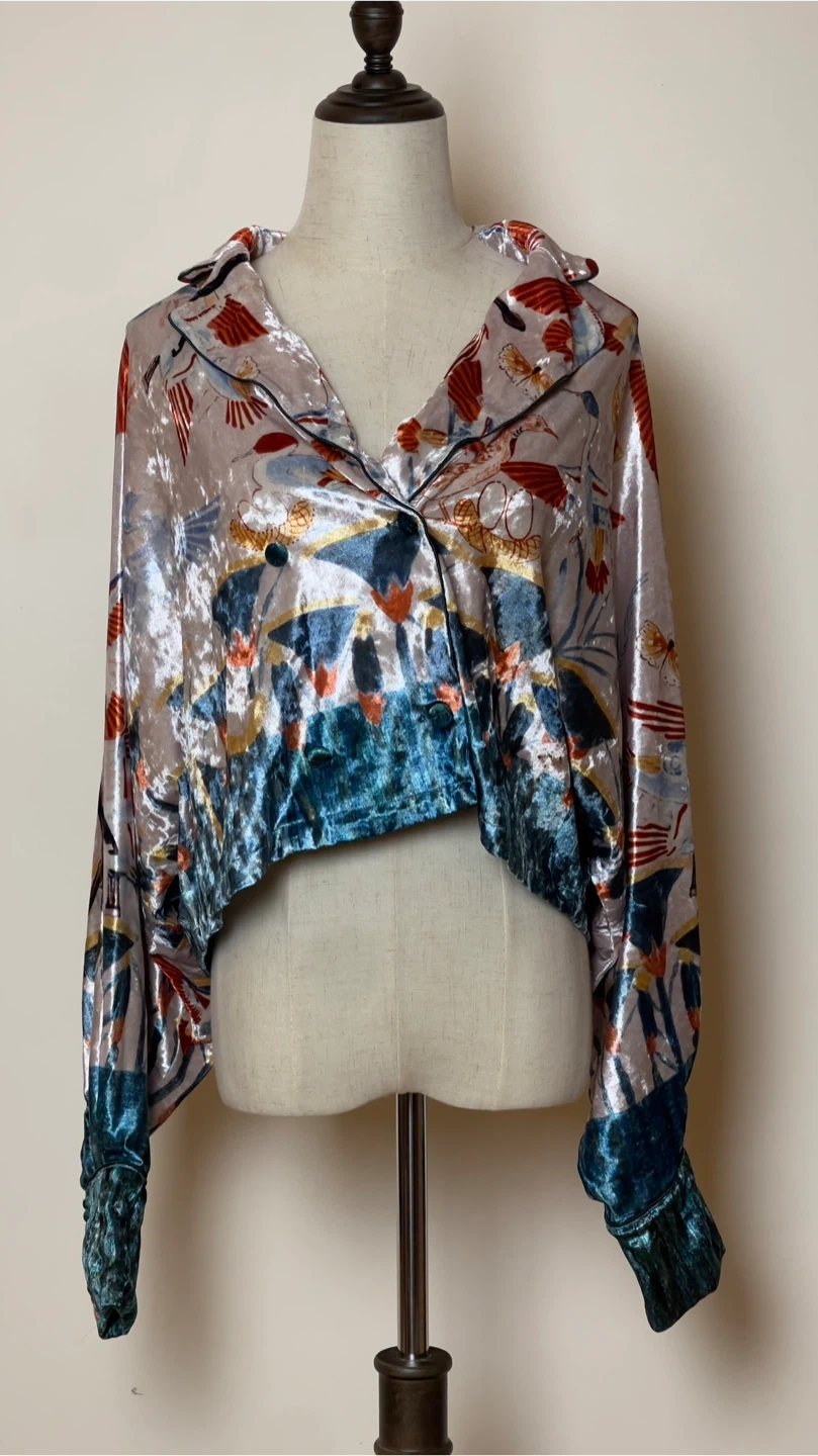 This unique burnout velvet blouse boasts a vibrant, artistic print. It features a classic collared neckline and a relaxed, cropped silhouette. The fabric has a shimmering, iridescent quality with eye-catching blue accents at the hem and cuffs.