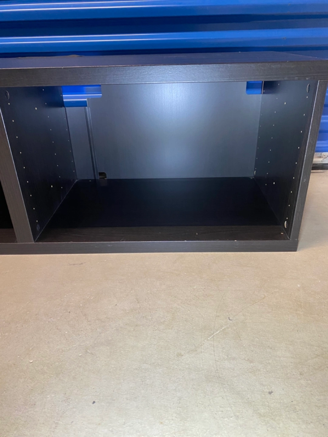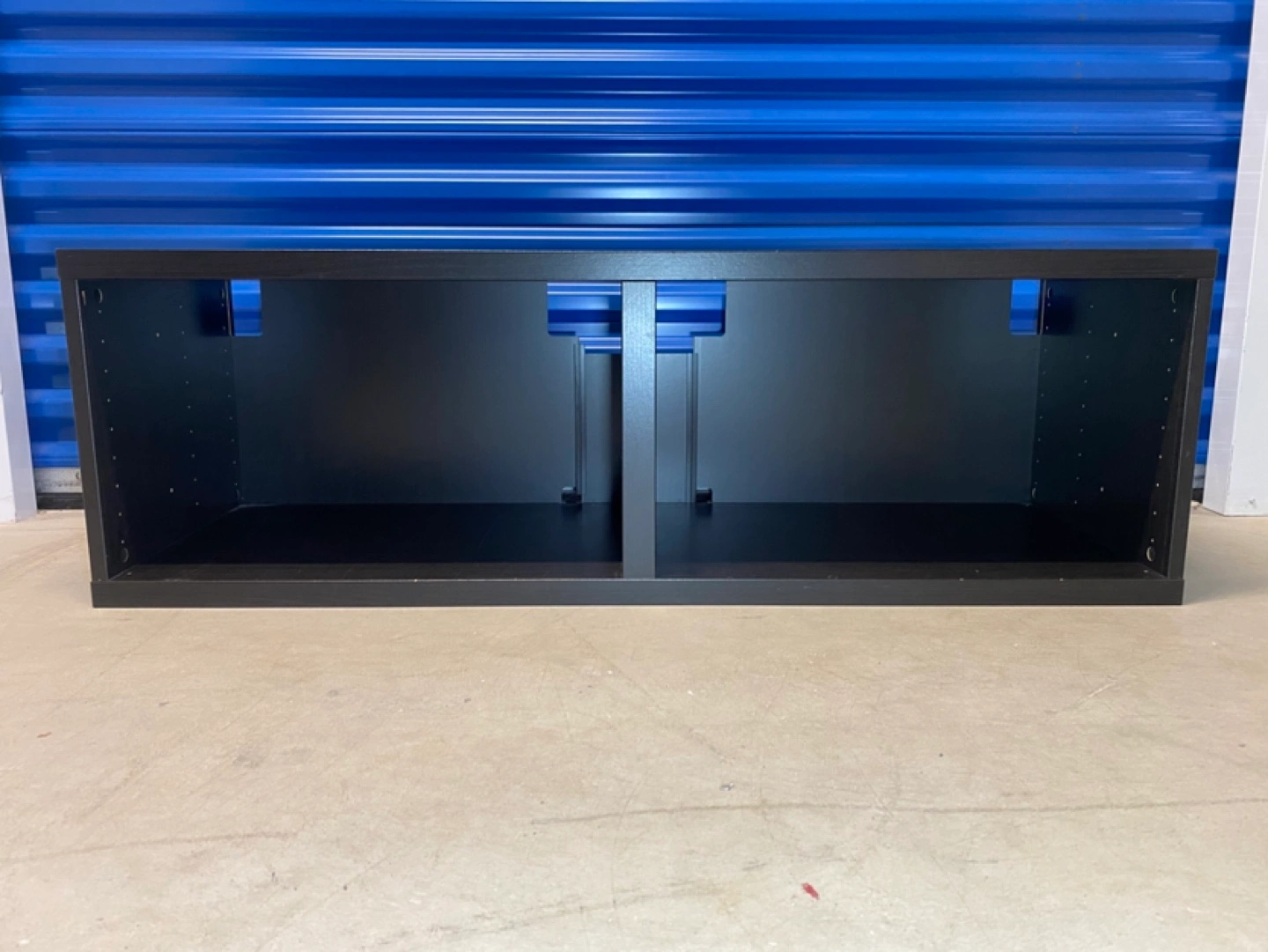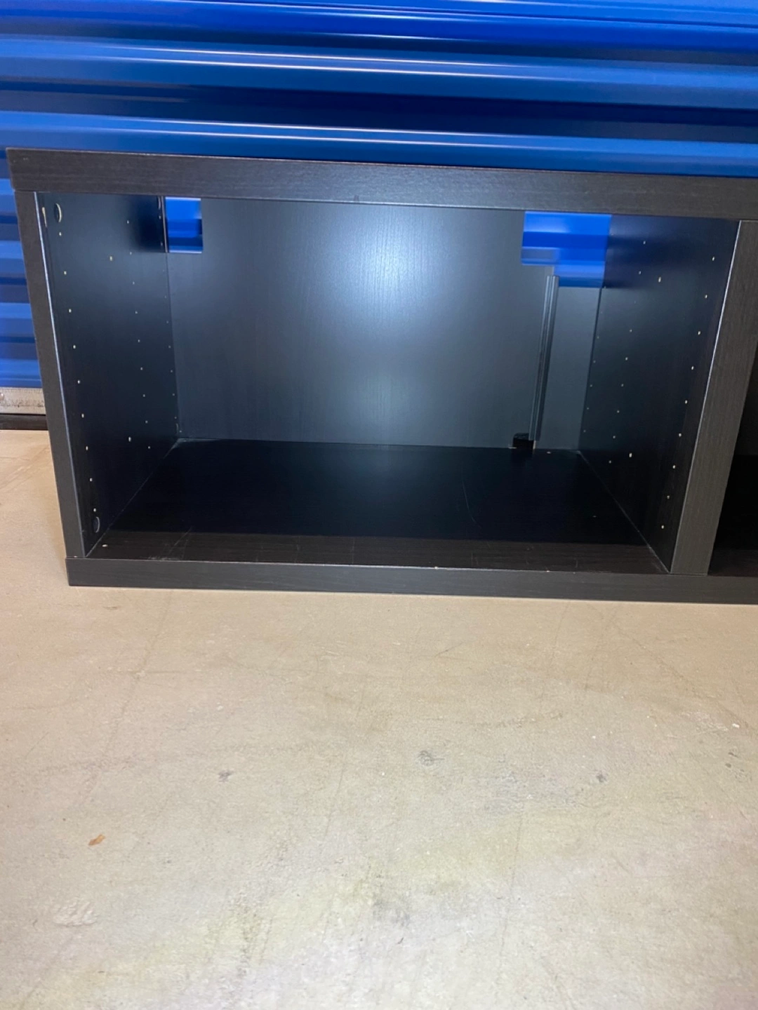 Several cord outlets in the back for wires/cables. Can be wall mounted. Can add units, organize with shelves, drawers or doors.