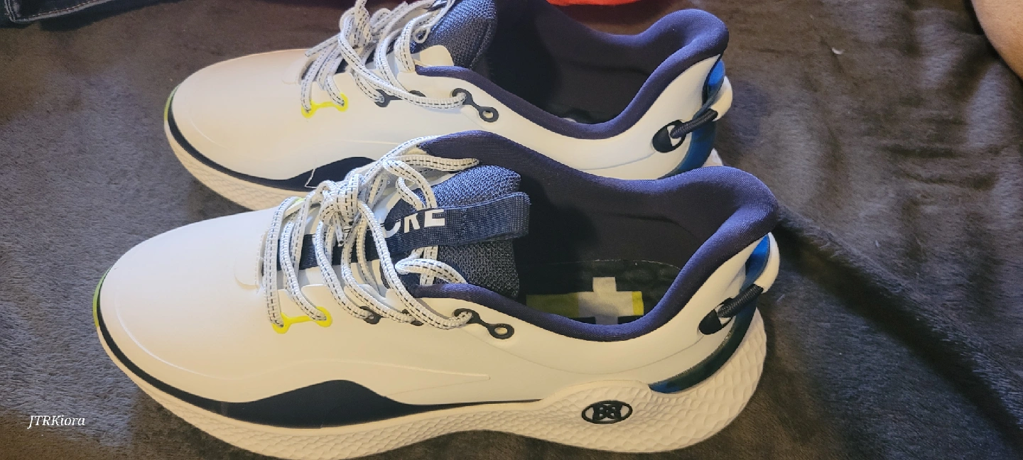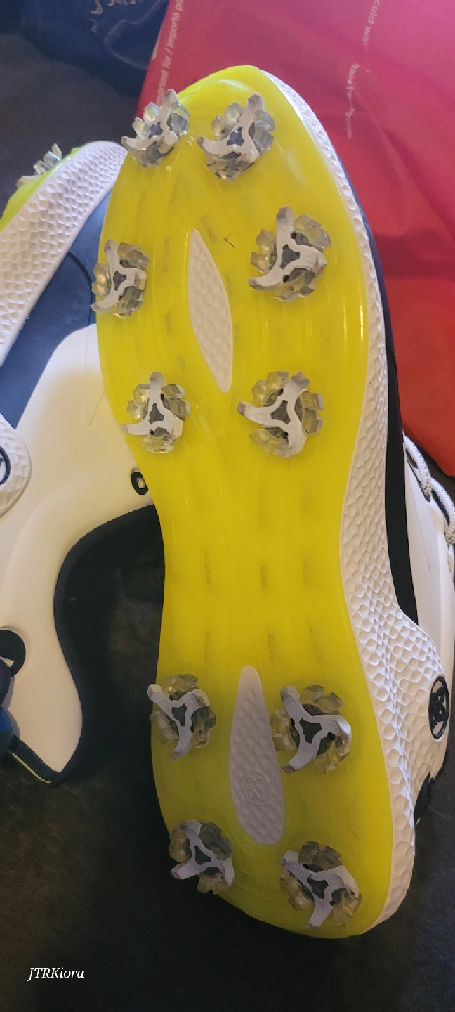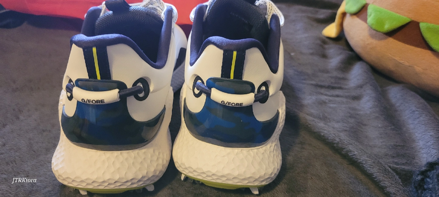 Selling a pair of G/FORE MG4+ O2 G/LOCK golf shoes in size 10 US. These stylish golf shoes feature a white and navy colour scheme. The style number is GMF000127. They have a cleated sole for great grip on the course