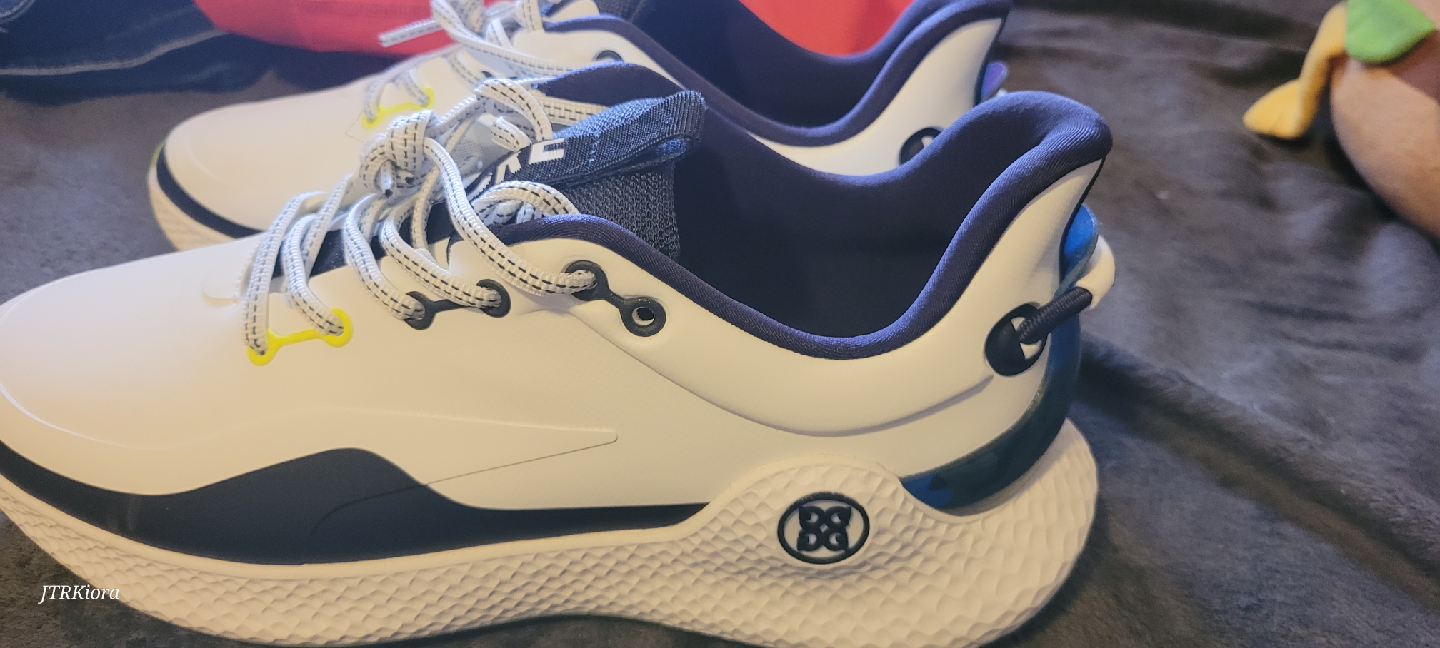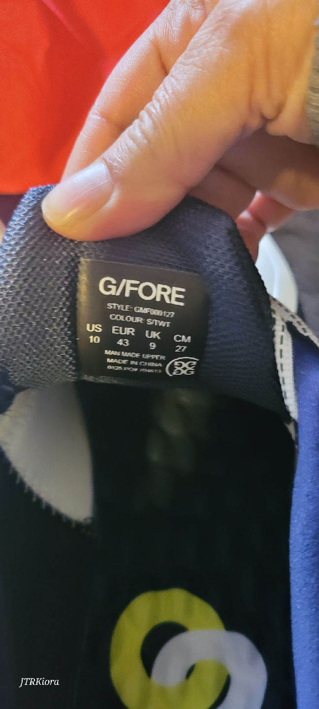 Selling a pair of G/FORE MG4+ O2 G/LOCK golf shoes in size 10 US. These stylish golf shoes feature a white and navy colour scheme. The style number is GMF000127. They have a cleated sole for great grip on the course