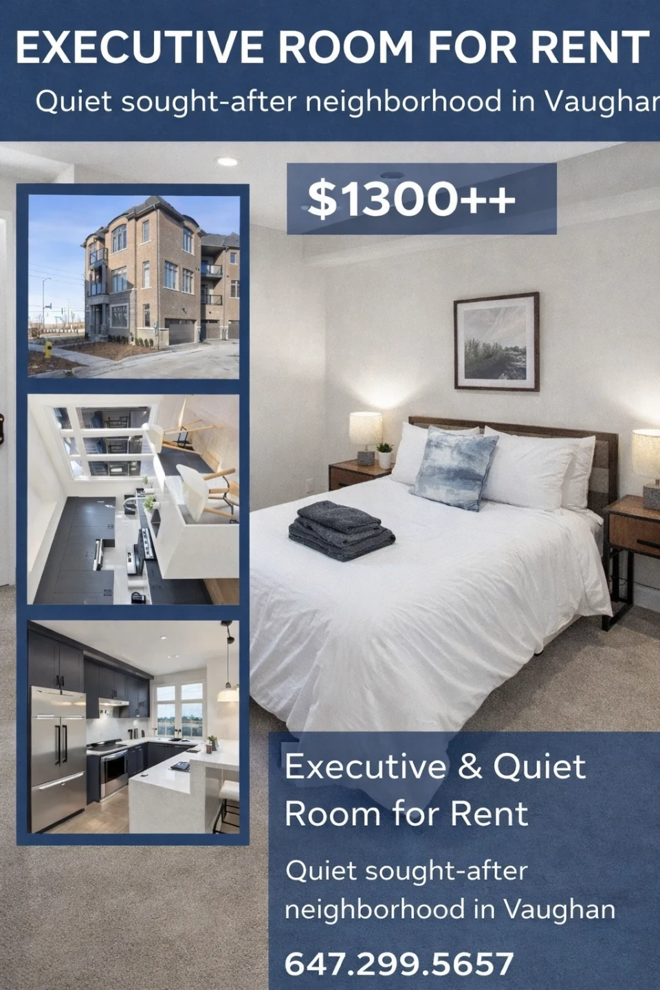 Executive & quiet room for rent in a sought-after neighbourhood in Vaughan. Includes a spacious bedroom and a modern kitchen. Available for $1100++. Now reduced to $1100