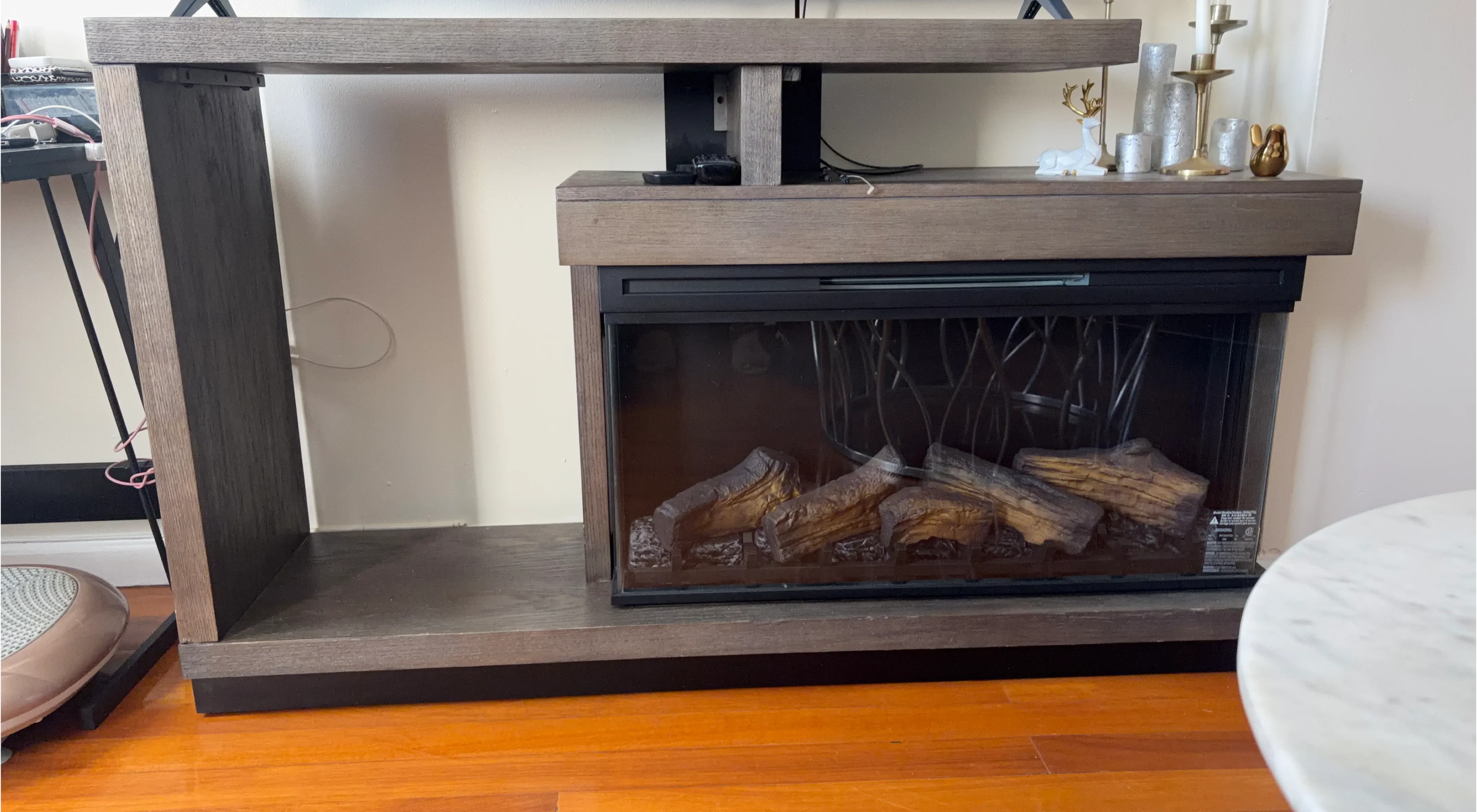 This electric fireplace and entertainment stand offers a warm ambiance with realistic logs. It's made of durable engineered wood in a neutral gray wood grain finish. It provides ample storage and display space for your media devices and decor.