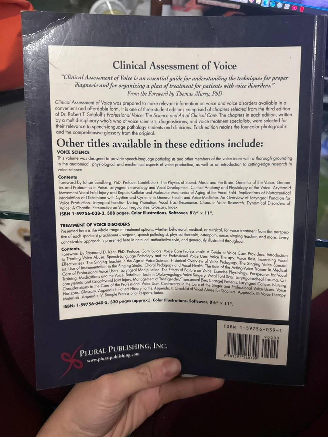 Clinical Assessment of Voice is an essential guide for understanding the techniques for proper diagnosis and for organizing a plan of treatment for patients with voice disorders. Written by a multidisciplinary who's who of voice scientists, diagnosticians, and voice treatment specialists. The book is 308 pages and includes color illustrations. Softcover, 8½" x 11".