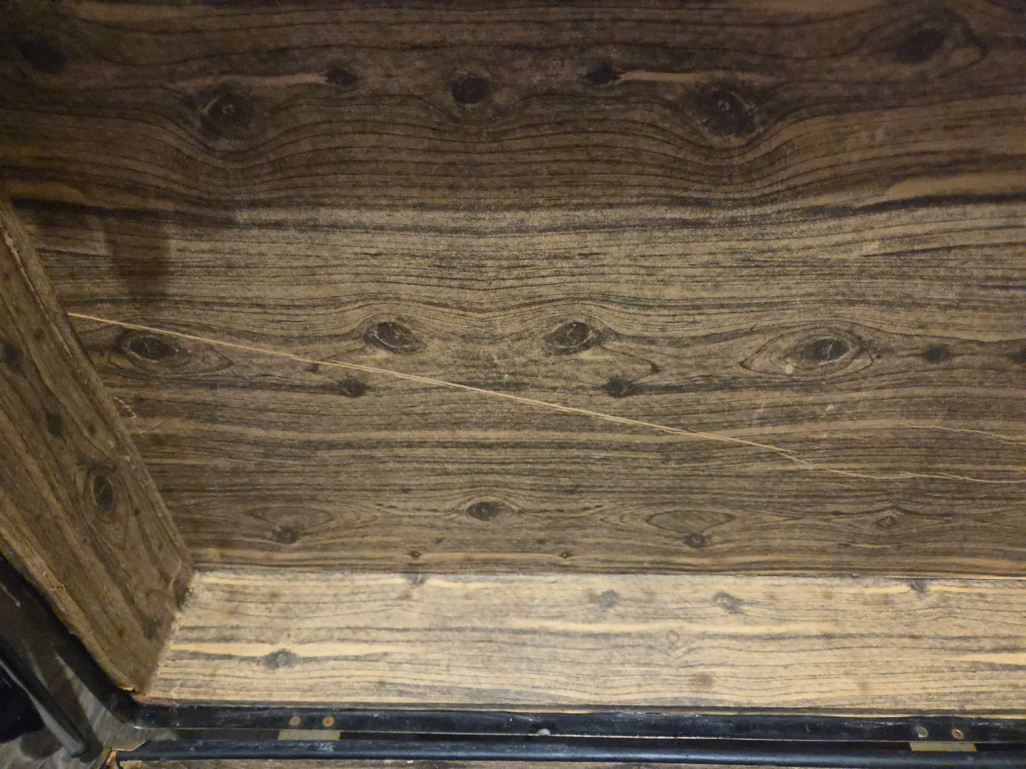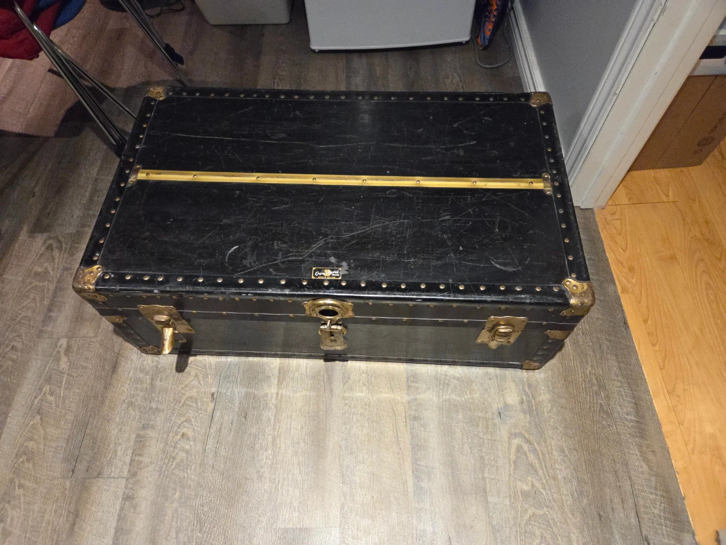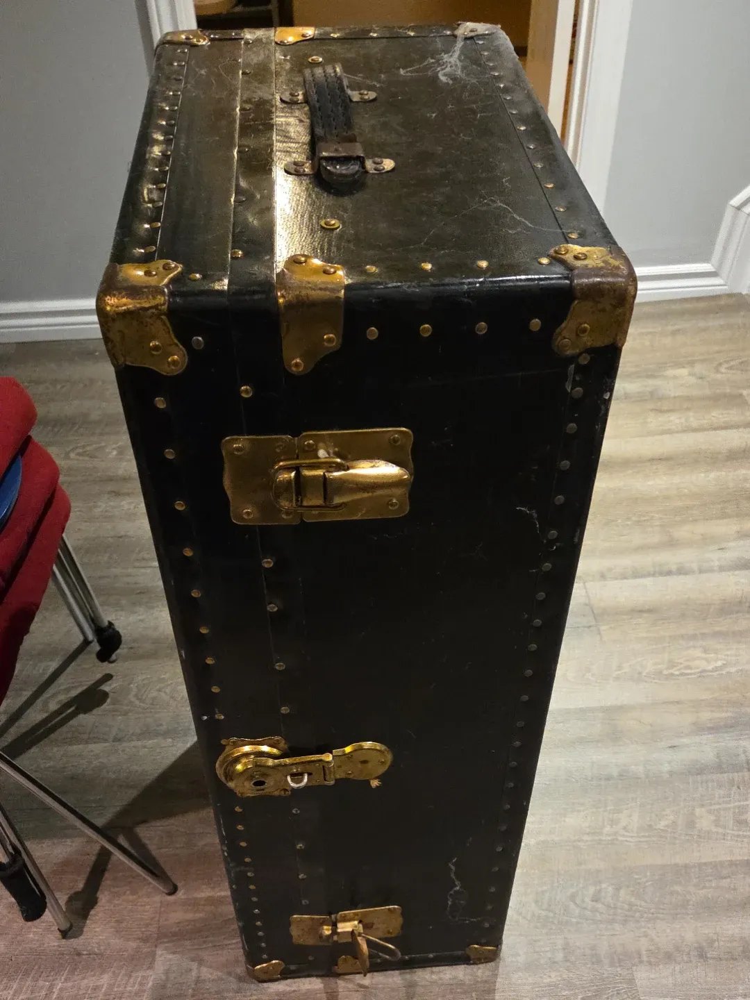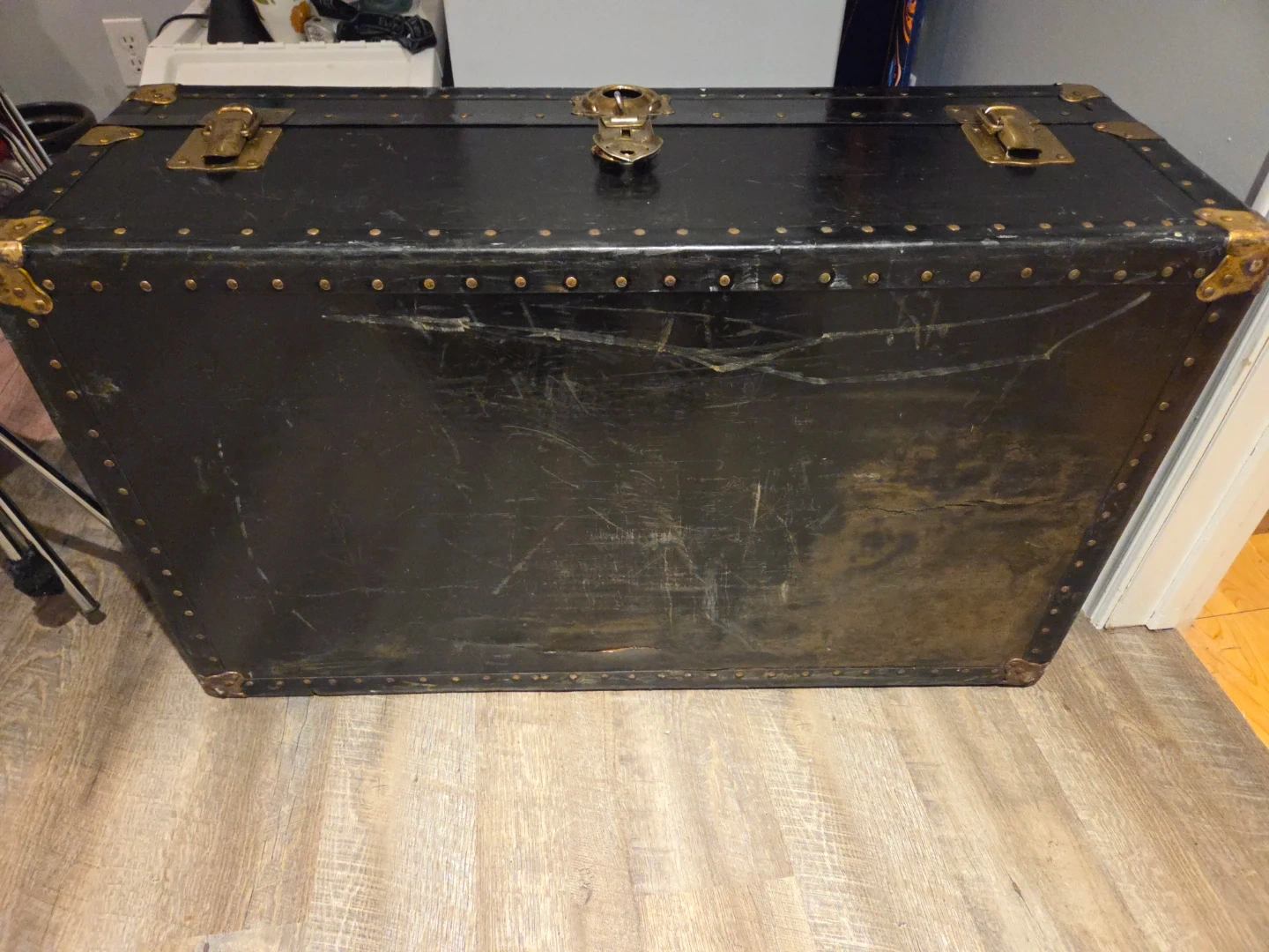 This vintage steamer trunk features a durable black exterior with decorative brass corner protectors and latches. The interior is lined with a wood-grain patterned material, offering a unique retro look. It's perfect for storage or as a decorative piece!
