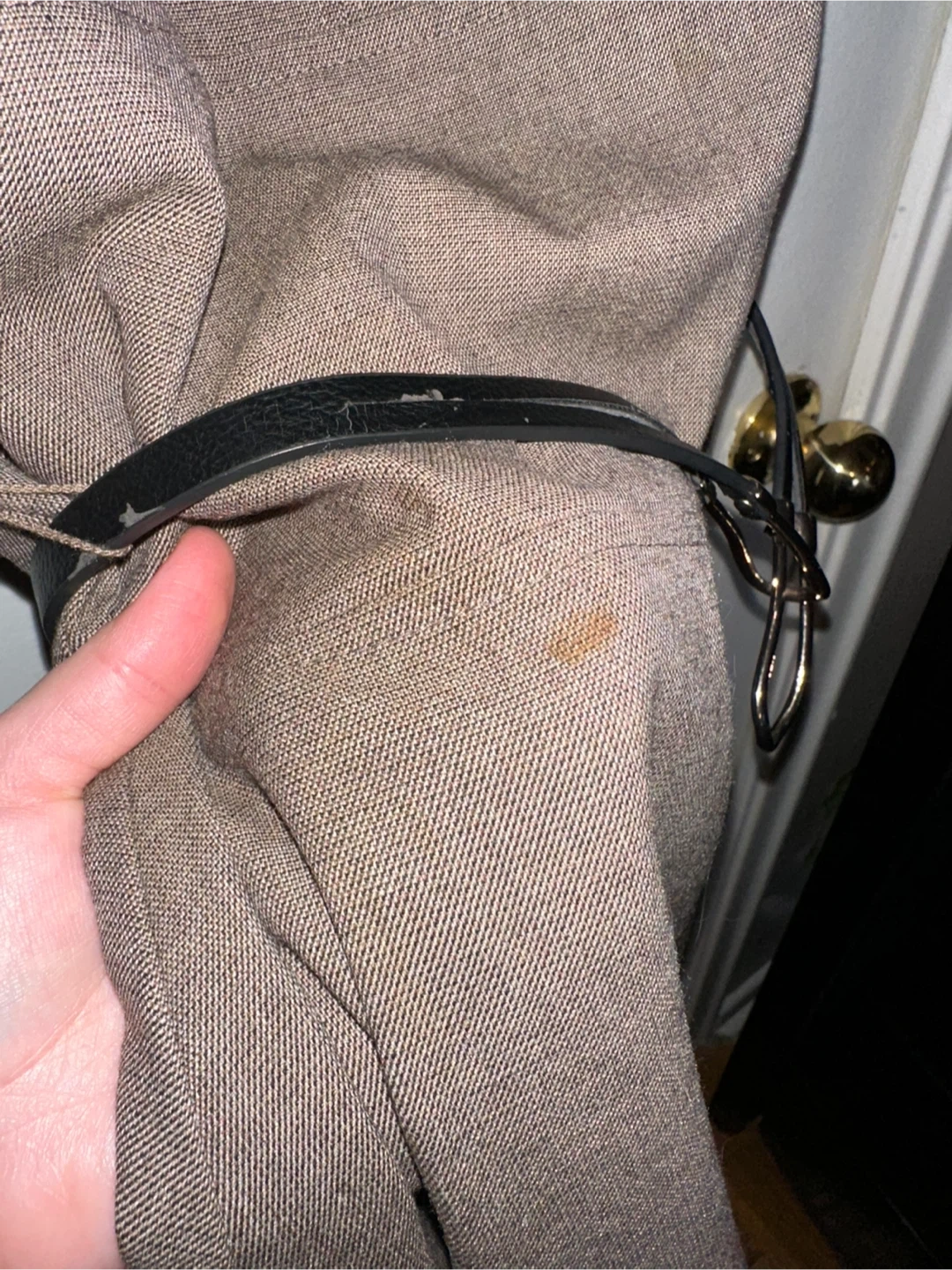 The only damage is a small spot of wear on the belt (can be worn without it or with another belt) and a tiny stain. I’m sure it will come out but I don’t want to make it worse so I’m not going to attempt it! I have bad luck with that stuff lol
