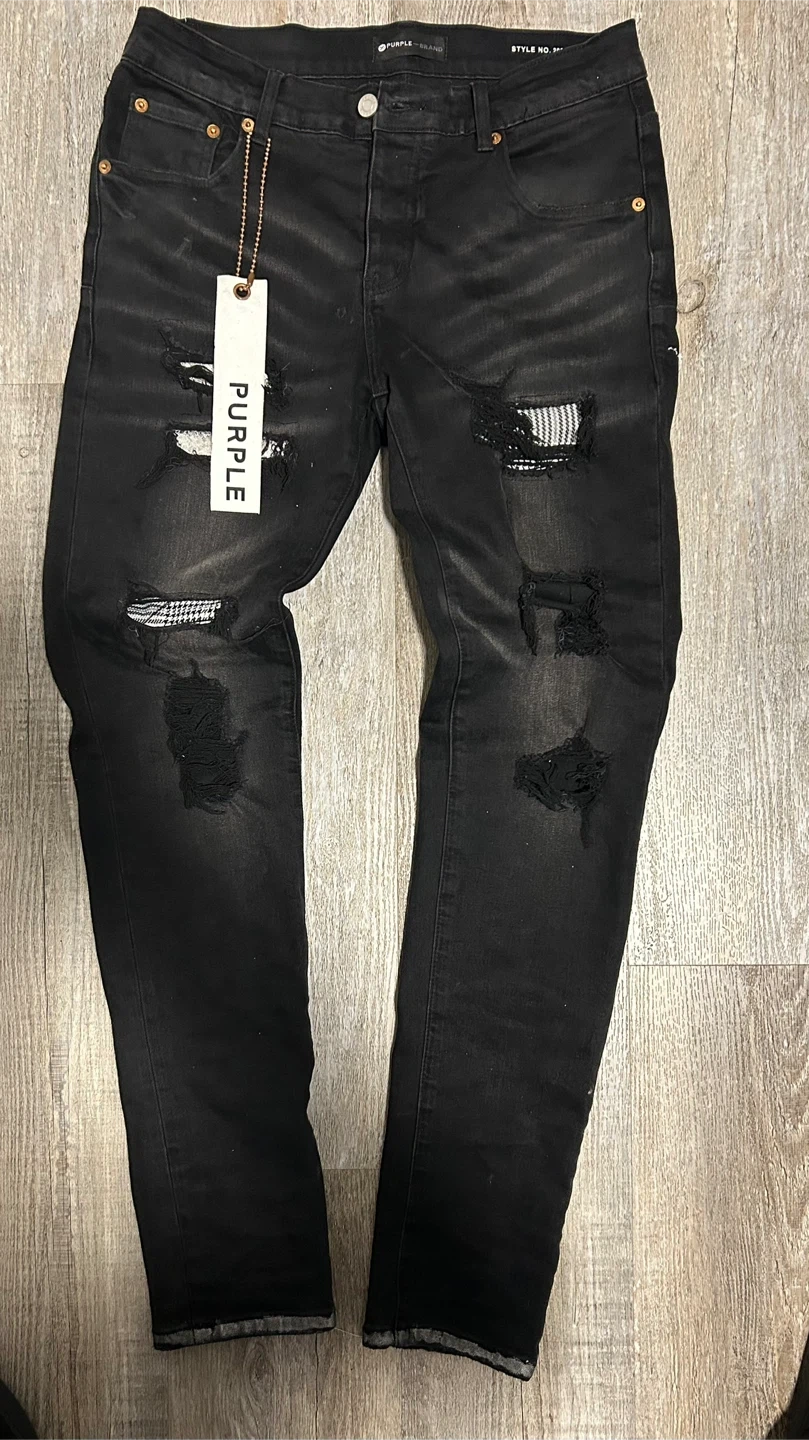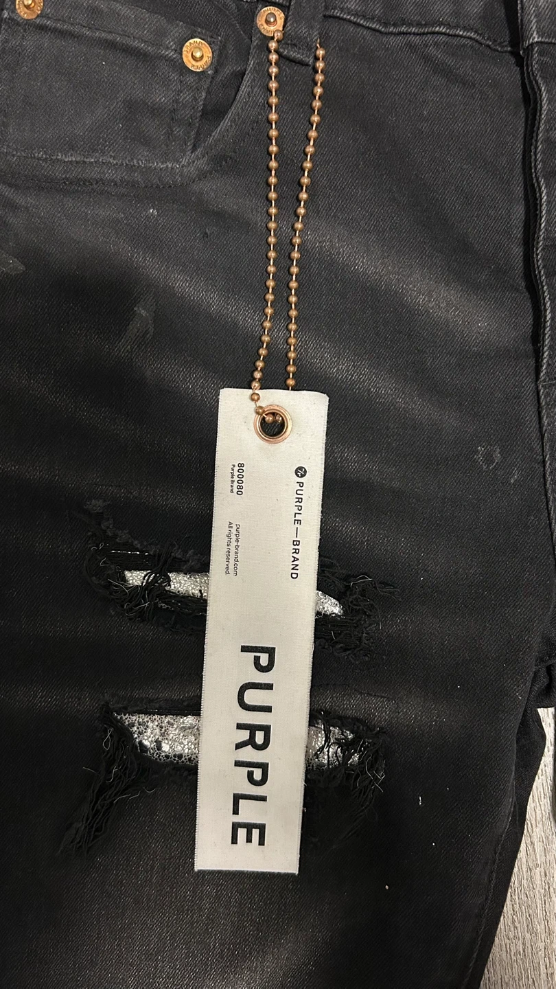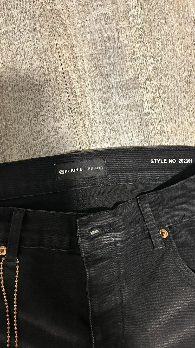 Selling a pair of Purple Brand P001 Slim Fit Low Rise jeans in black. They feature hidden back pocket rivets, corded belt loops, and reinforced belt loop bearing. Great condition!