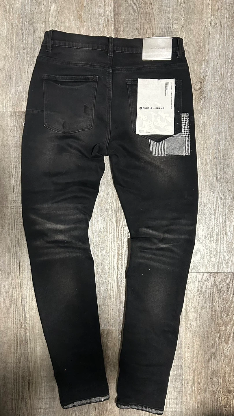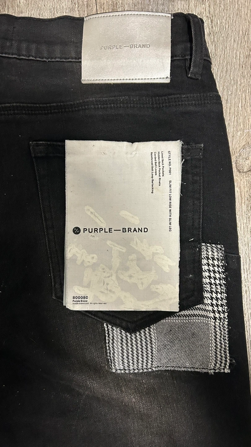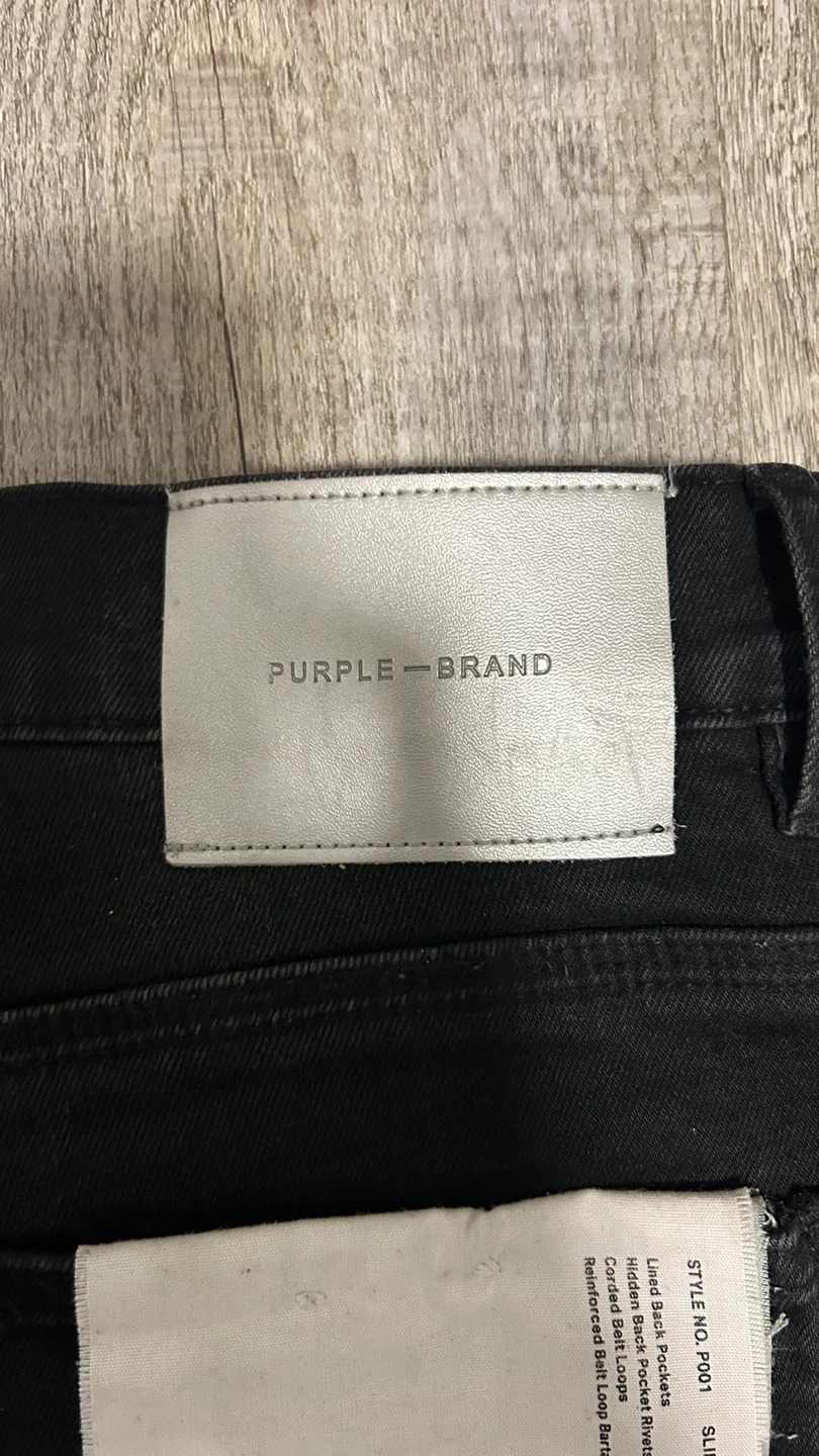 Selling a pair of Purple Brand P001 Slim Fit Low Rise jeans in black. They feature hidden back pocket rivets, corded belt loops, and reinforced belt loop bearing. Great condition!