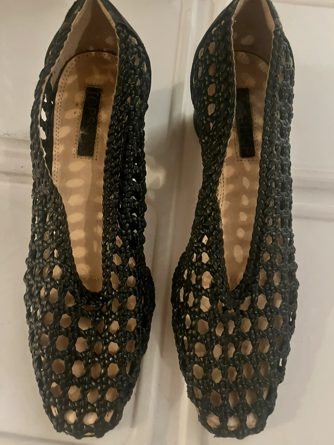 Stylish TOPSHOP black woven heeled shoes. Features a unique open-weave design.
