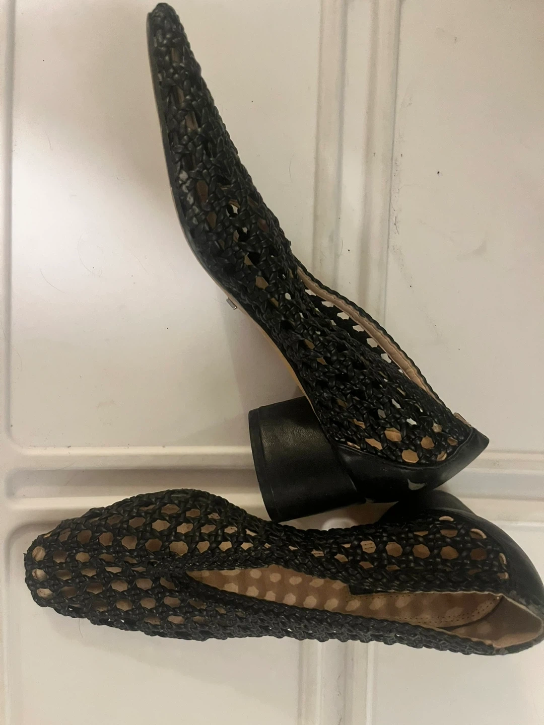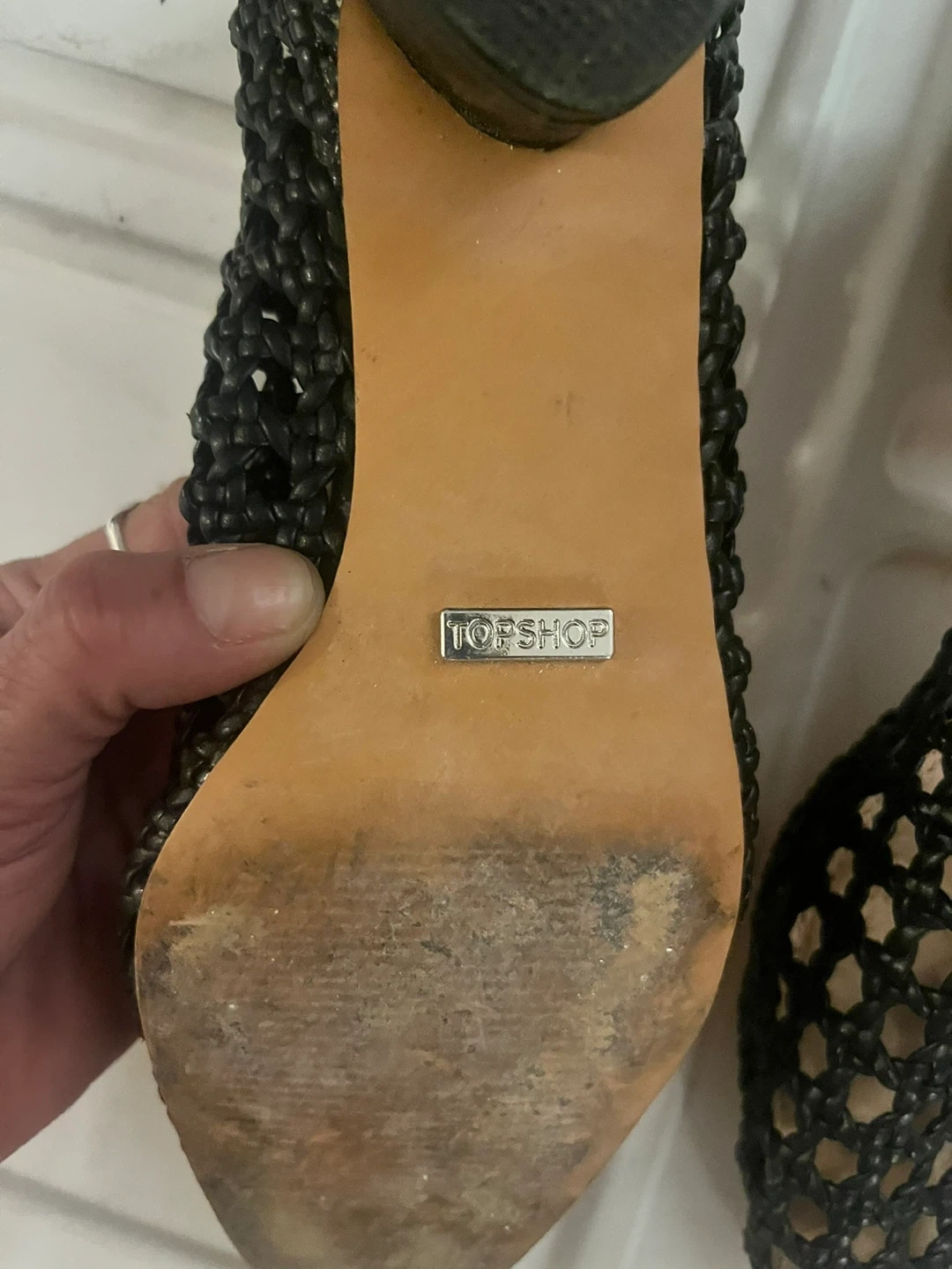 Stylish TOPSHOP black woven heeled shoes. Features a unique open-weave design.