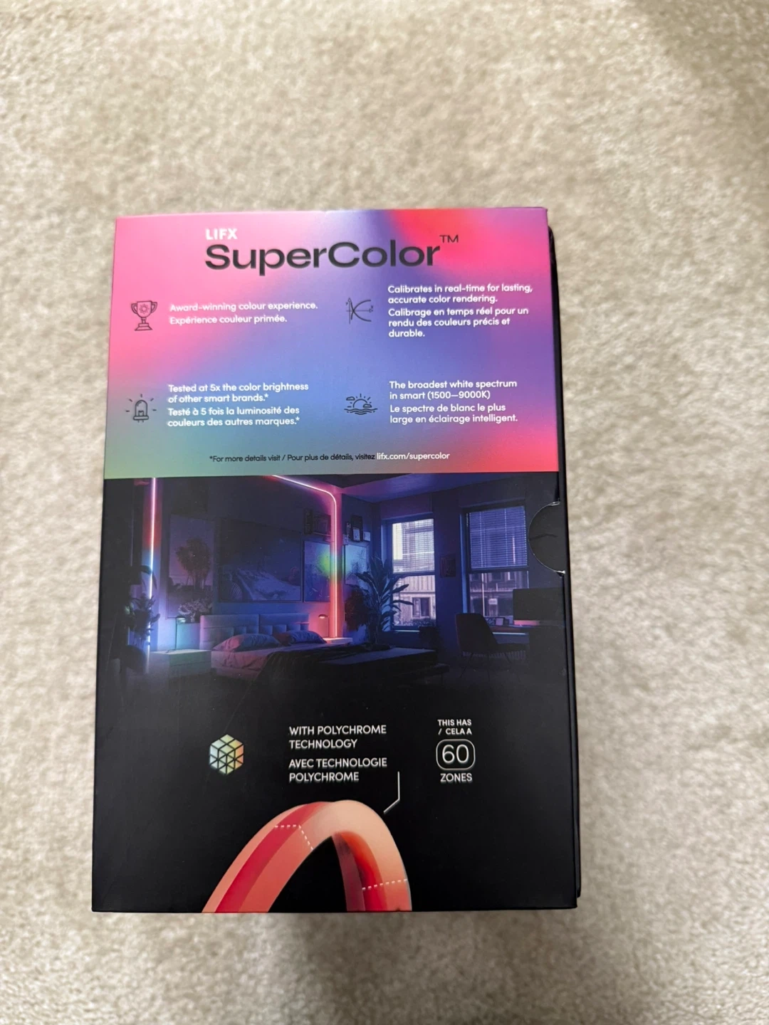 This is a LIFX Neon Flex 5m LED rope light. It's a SuperColor product with polychrome technology. It connects via Wi-Fi and works with Google Home and Alexa.