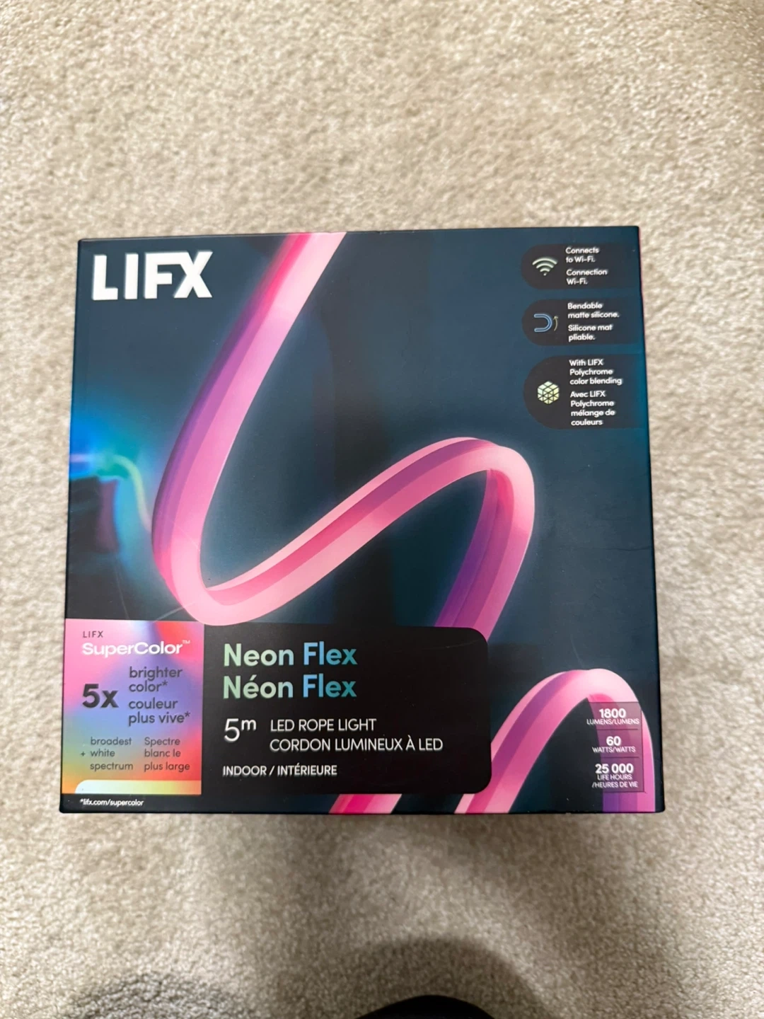 This is a LIFX Neon Flex 5m LED rope light. It's a SuperColor product with polychrome technology. It connects via Wi-Fi and works with Google Home and Alexa.