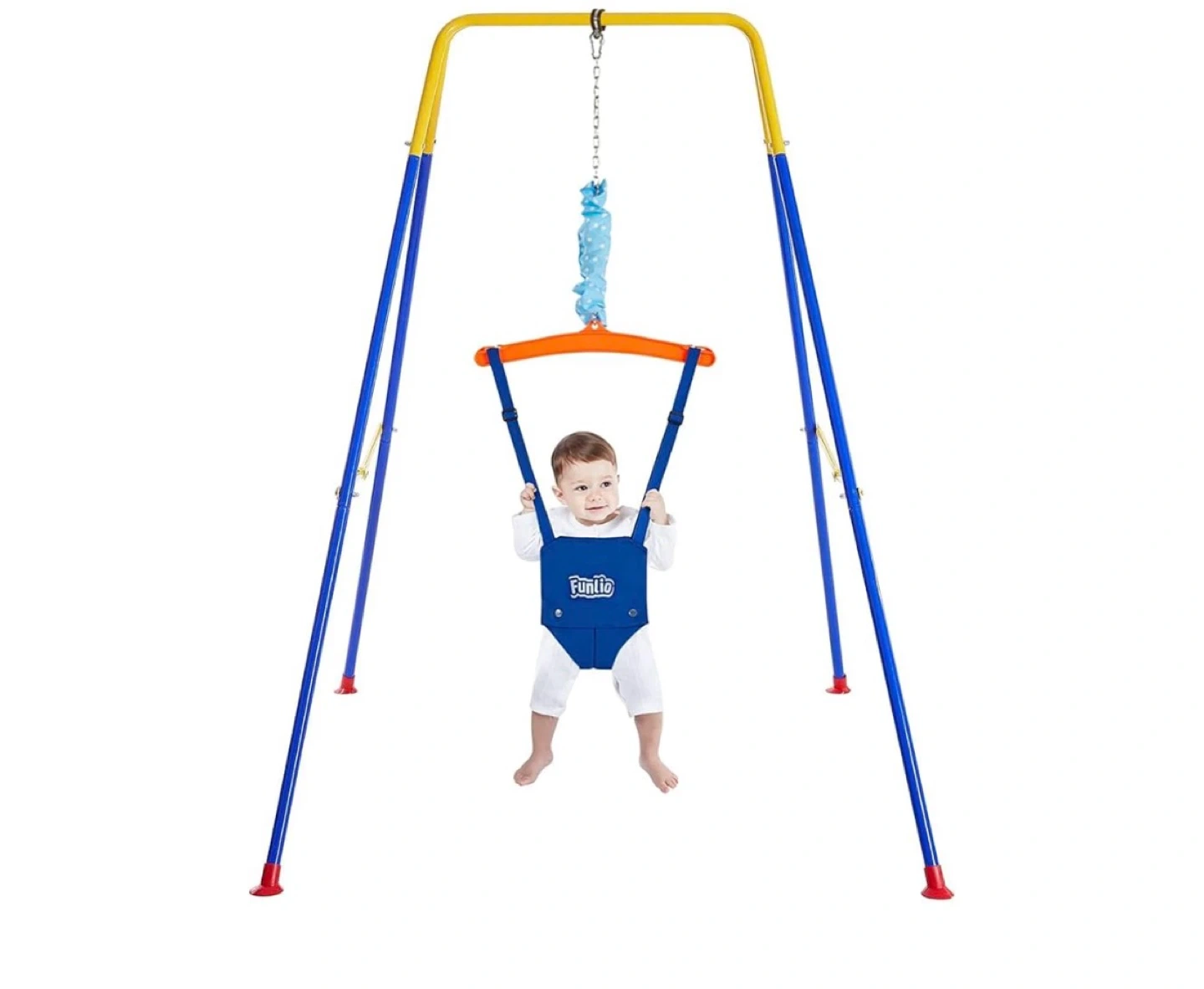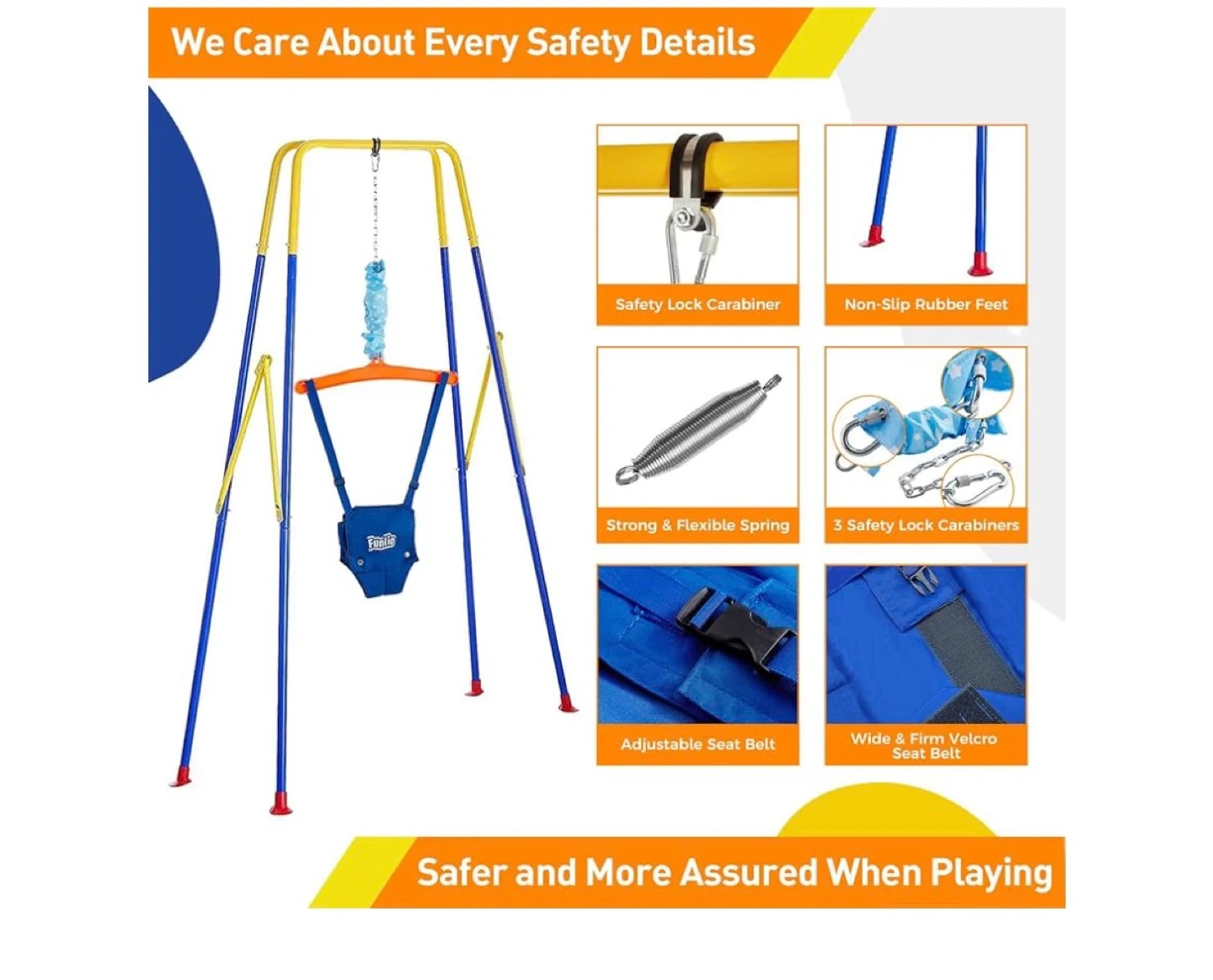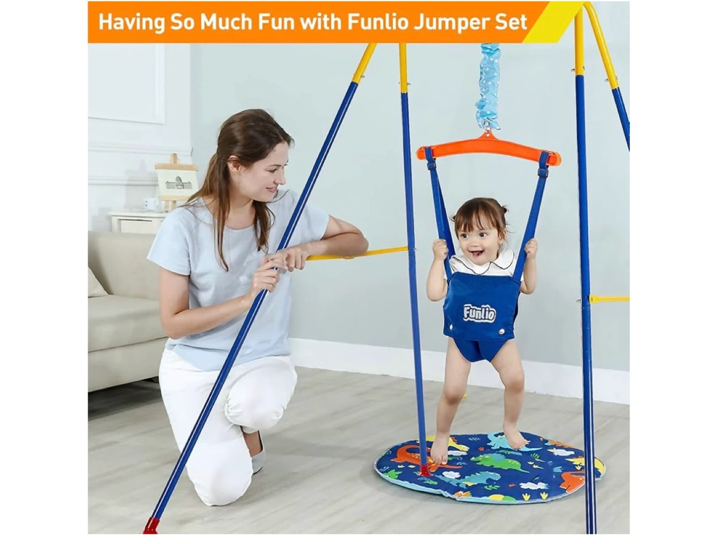 This Funio baby jumper set includes a sturdy frame with non-slip rubber feet and a strong, flexible spring. It has a wide and firm velcro seat belt for adjustability and safety. The jumper provides a secure and fun way for little ones to bounce!