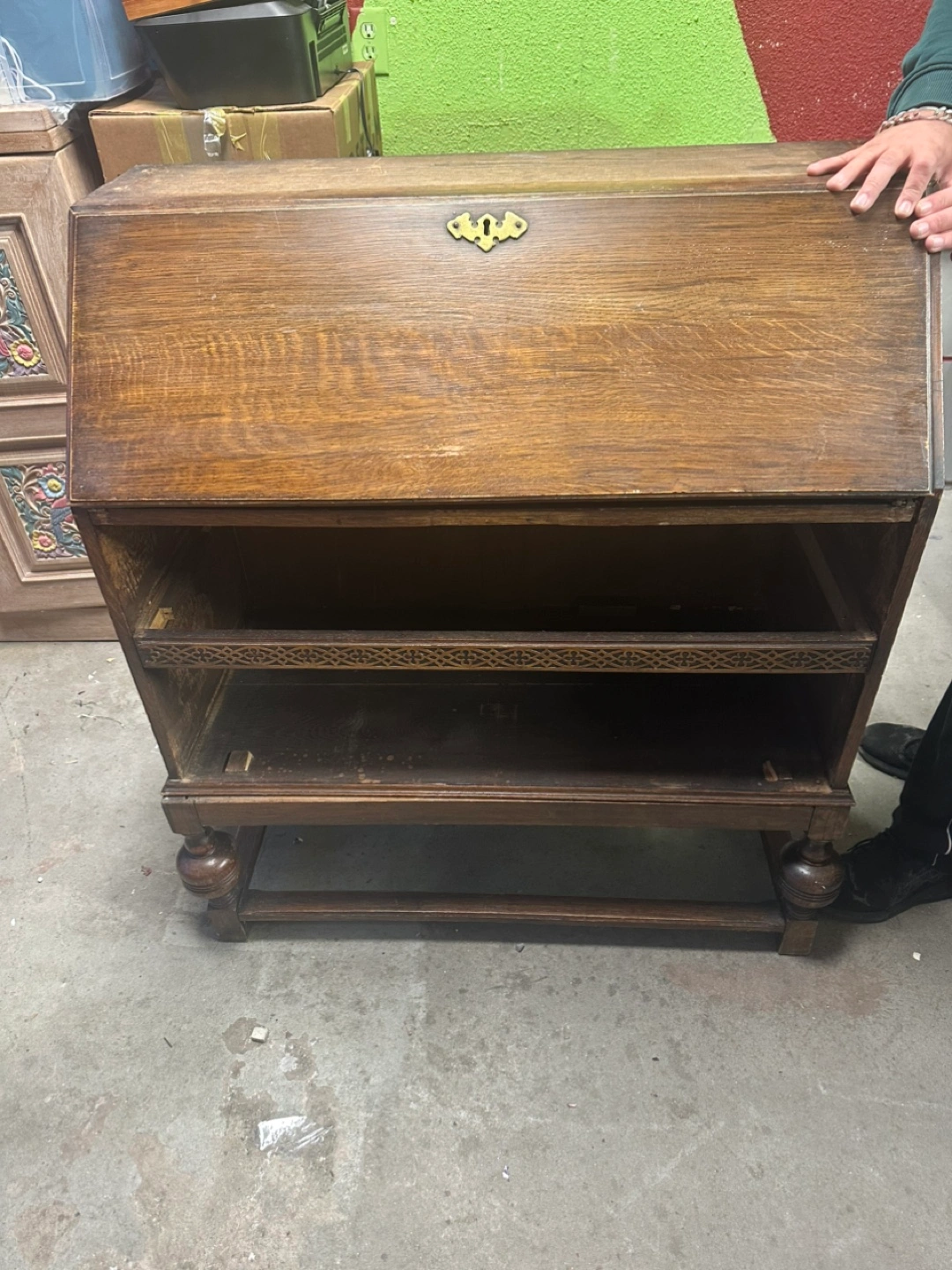 Antique-style secretary desk. Dark wood finish. Features a drop-down writing surface, interior compartments, and a shelf. Ornate detailing. Excellent for storage and writing.