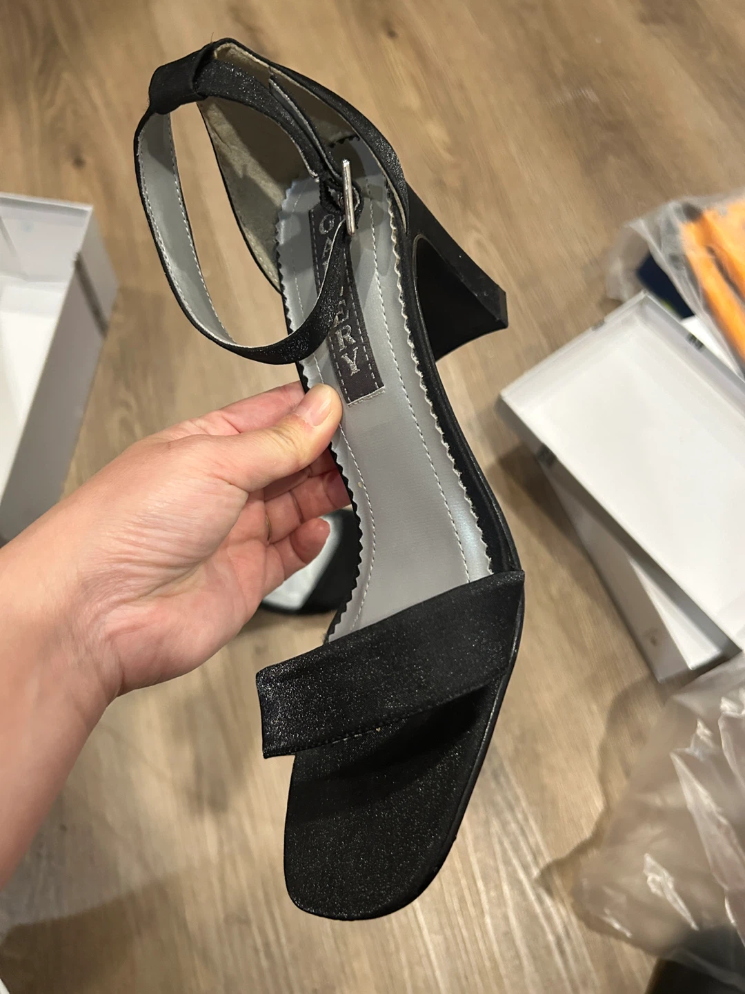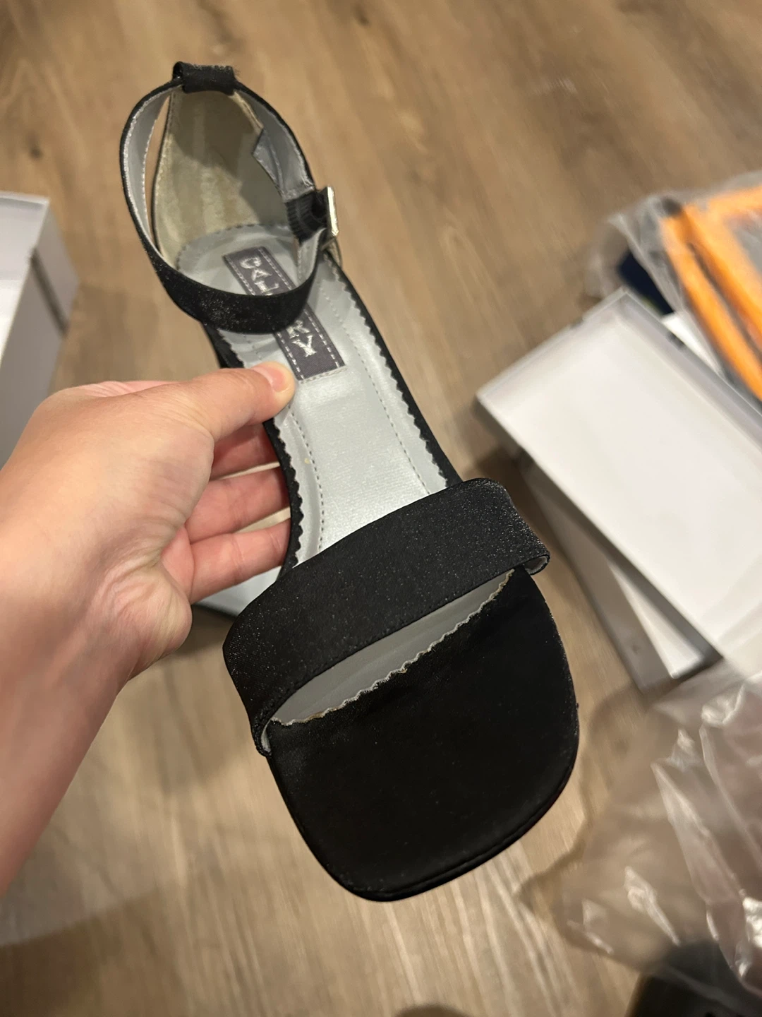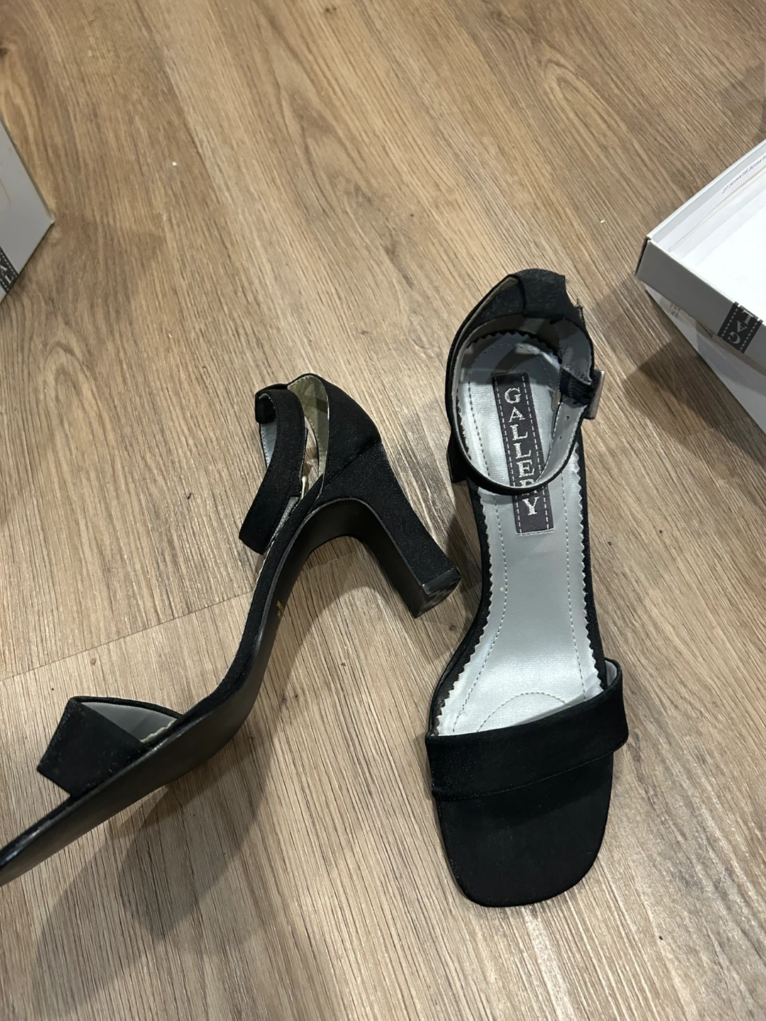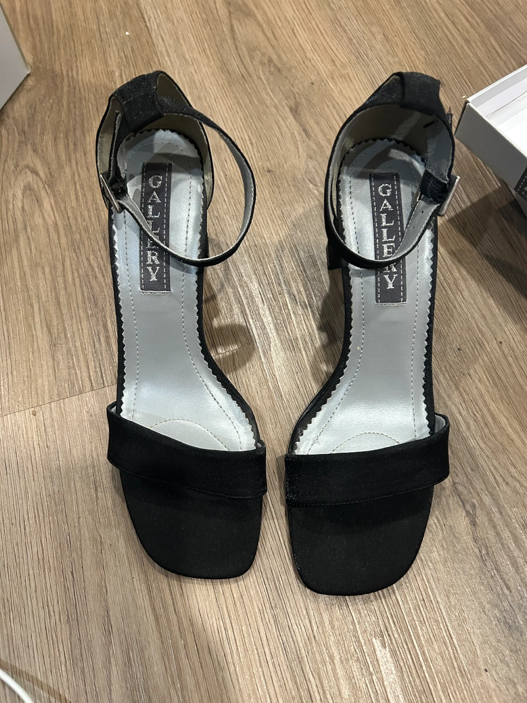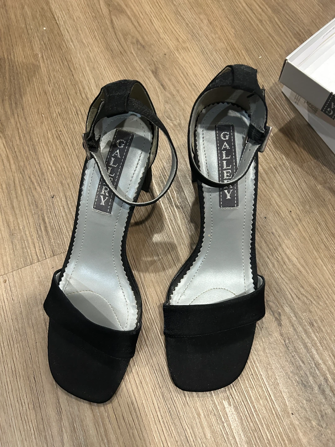 These GALLEY heeled sandals are black with an ankle strap closure. The sandal has a fabric upper and a block heel. Perfect for dressing up an outfit!