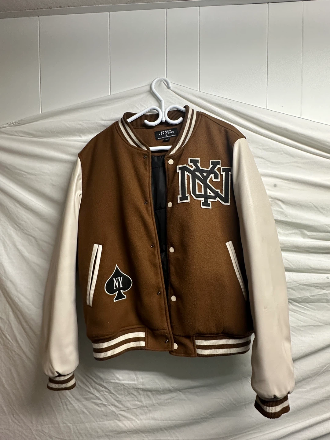 Selling a stylish Urban Heritage varsity jacket in size medium. It's a cool brown colour with cream-coloured sleeves and striped detailing. Perfect for adding a bit of flair to your wardrobe!