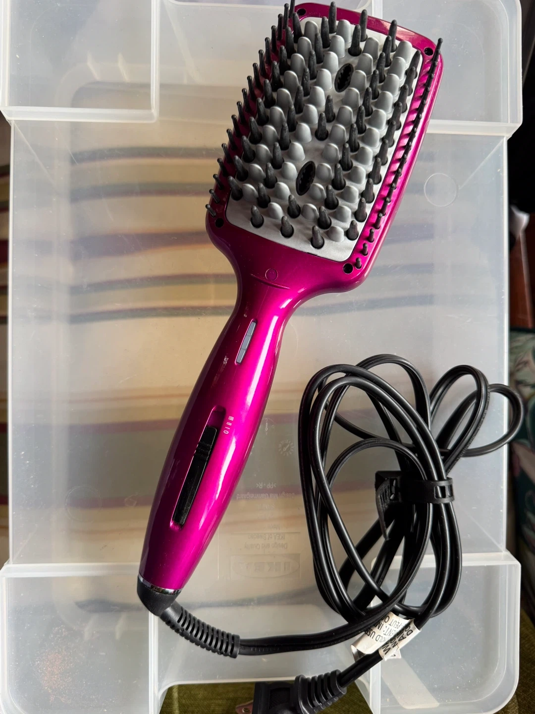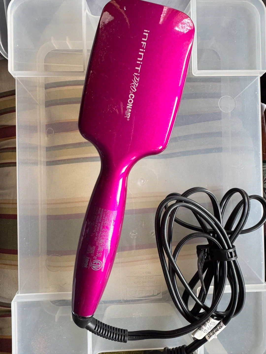 New Conair Infiniti Pro Heated Hair Straightening Brush. This heated brush helps to straighten hair quickly and efficiently. It's a vibrant pink colour. Perfect for achieving smooth, sleek hairstyles at home!