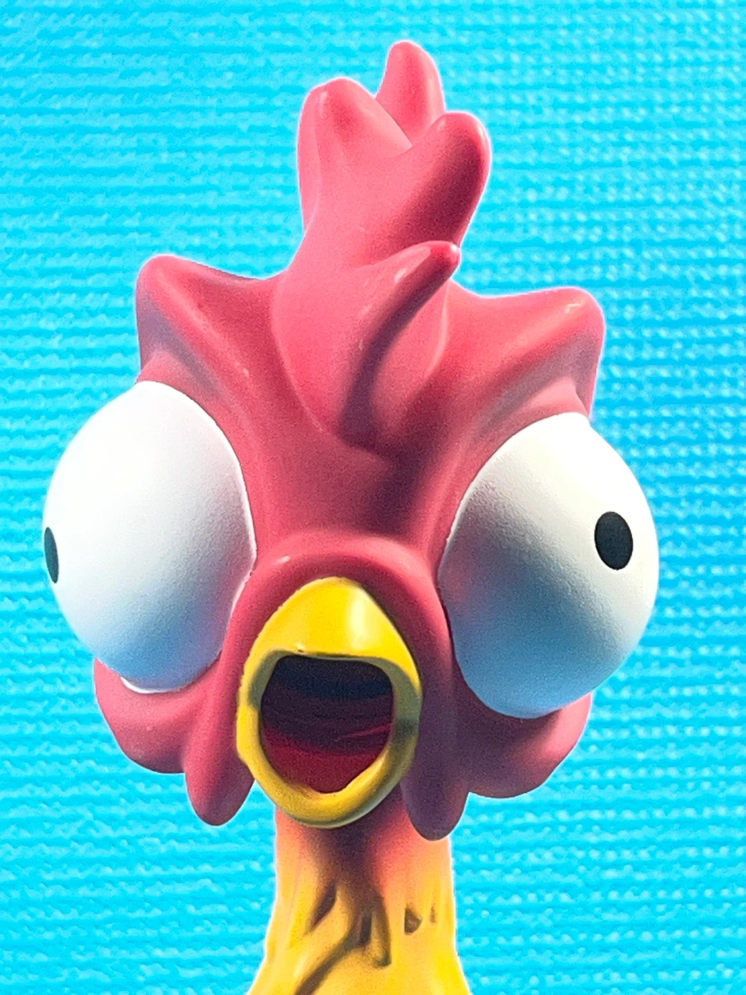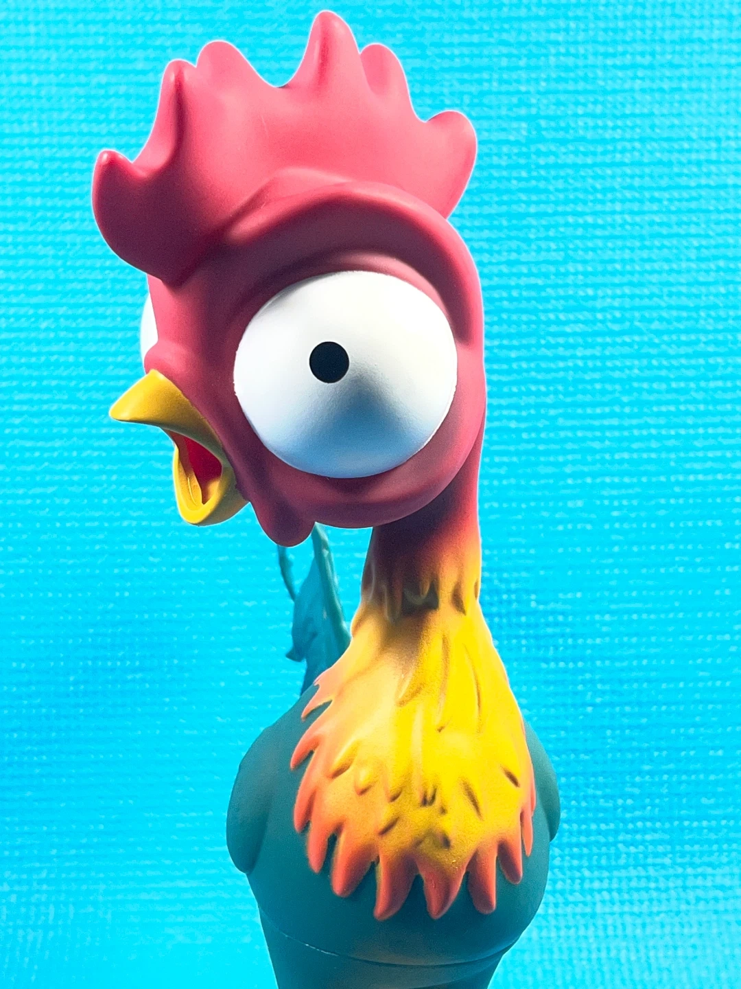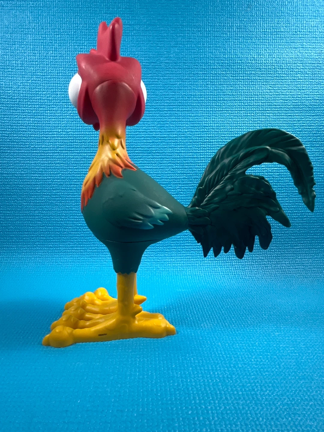 Plastic figure of Hei Hei from Disney's Moana. Red head with large white eyes, yellow beak, and a green body with yellow feet.