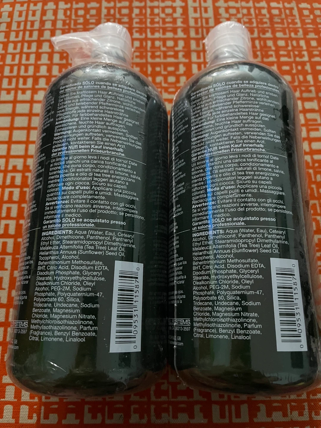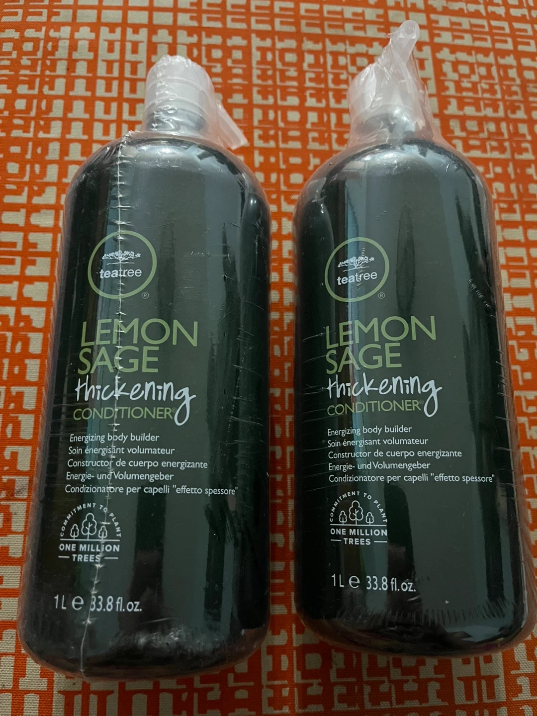 I have two bottles of Tea Tree Lemon Sage Thickening Conditioner, each containing 1L. This conditioner is designed to energize and volumize hair. It's a great way to give your hair a little extra body and shine