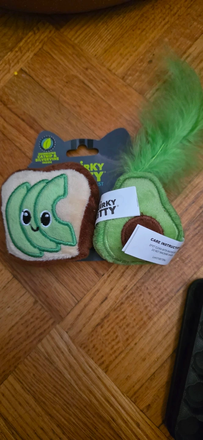 Two plush catnip toys, one shaped like avocado and the other like toast. Energizing catnip and silvervine inside. Spot clean only with water.