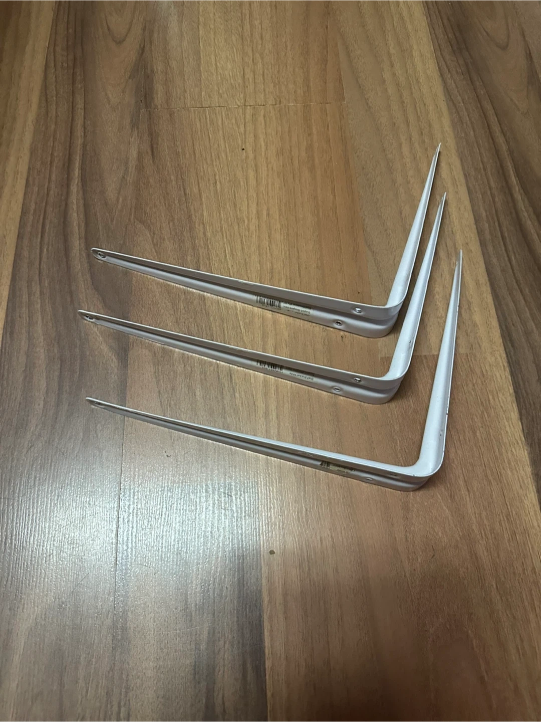 Selling a set of three white shelf brackets. They're in good condition and ready to help you organize your space. Perfect for adding some extra storage to any room in your home.