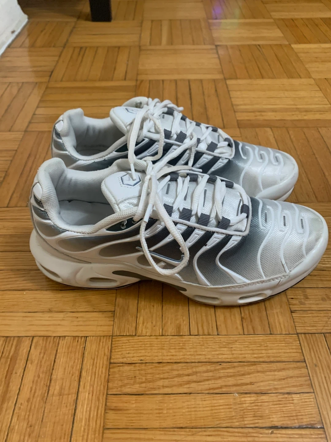 These Nike Air Max Plus TN SE shoes are in a white and grey colourway. They feature the classic TN Air cushioning for comfort. Perfect for everyday wear or light athletic activities. US 8 to 8.5 M