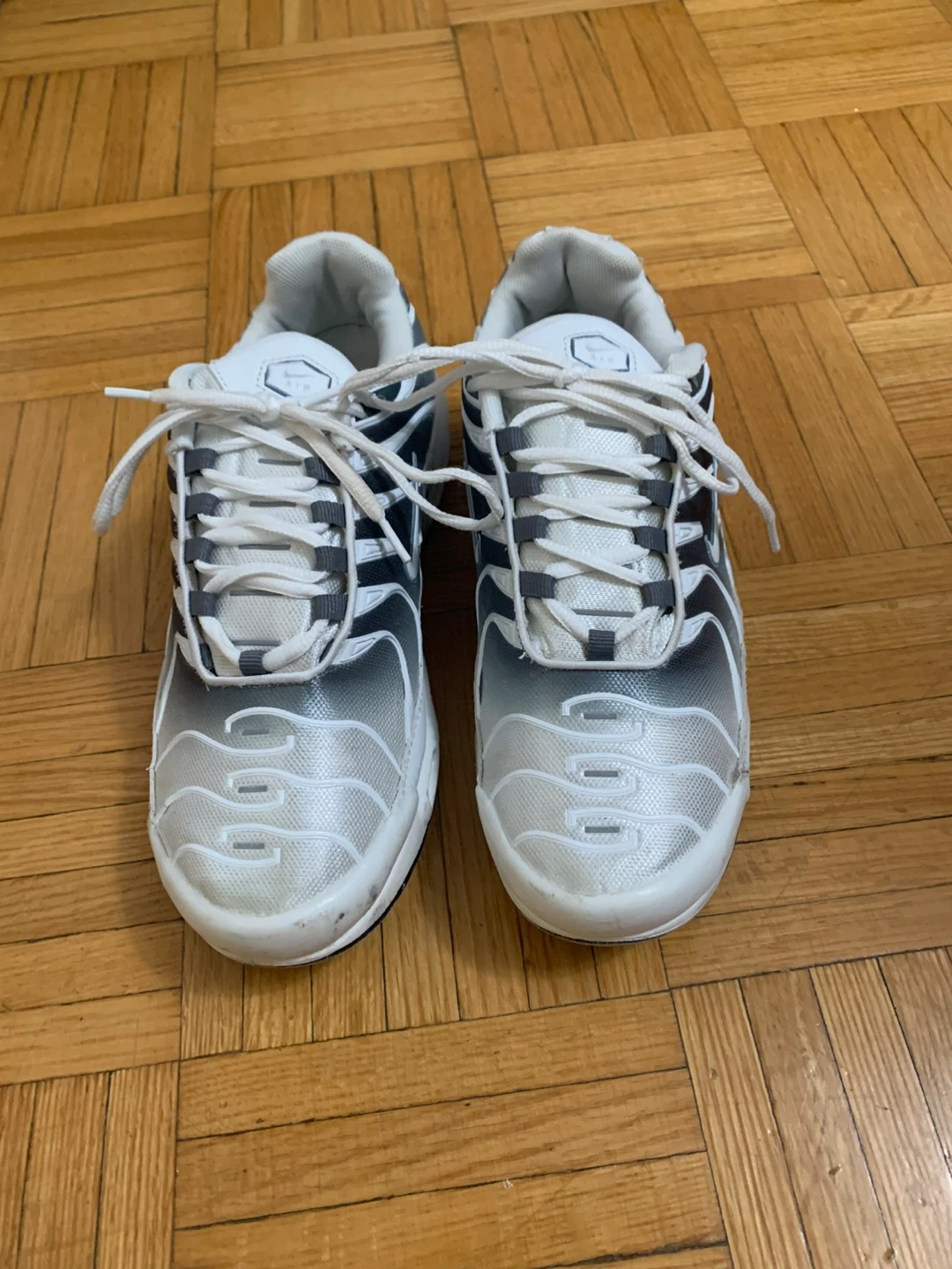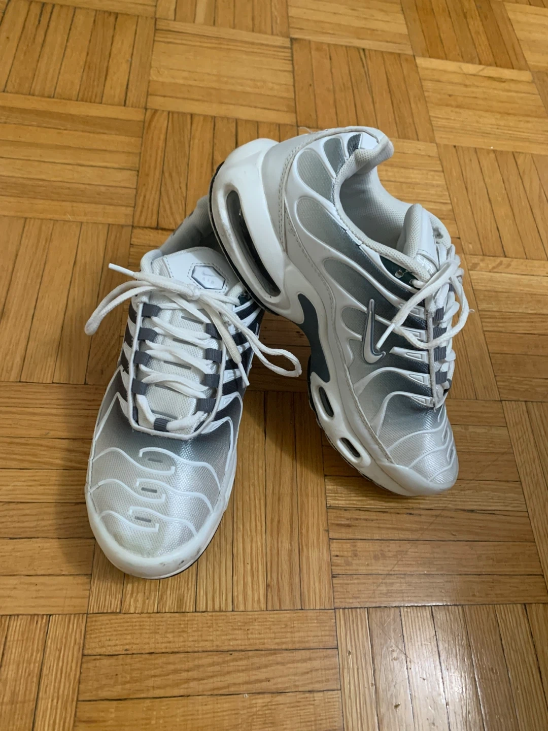 These Nike Air Max Plus TN SE shoes are in a white and grey colourway. They feature the classic TN Air cushioning for comfort. Perfect for everyday wear or light athletic activities. US 8 to 8.5 M