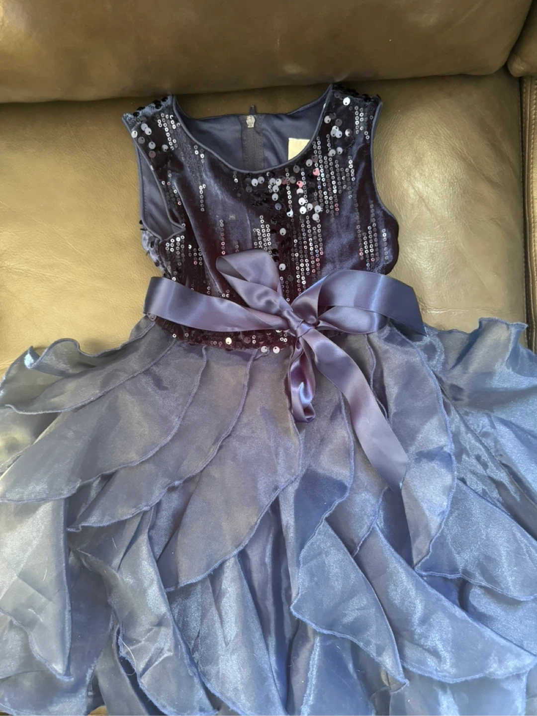It's a darling navy blue dress for girls, featuring a sequined bodice and a layered ruffle skirt. A satin ribbon bow adds a sweet touch to the waist. This dress is perfect for parties and special occasions!