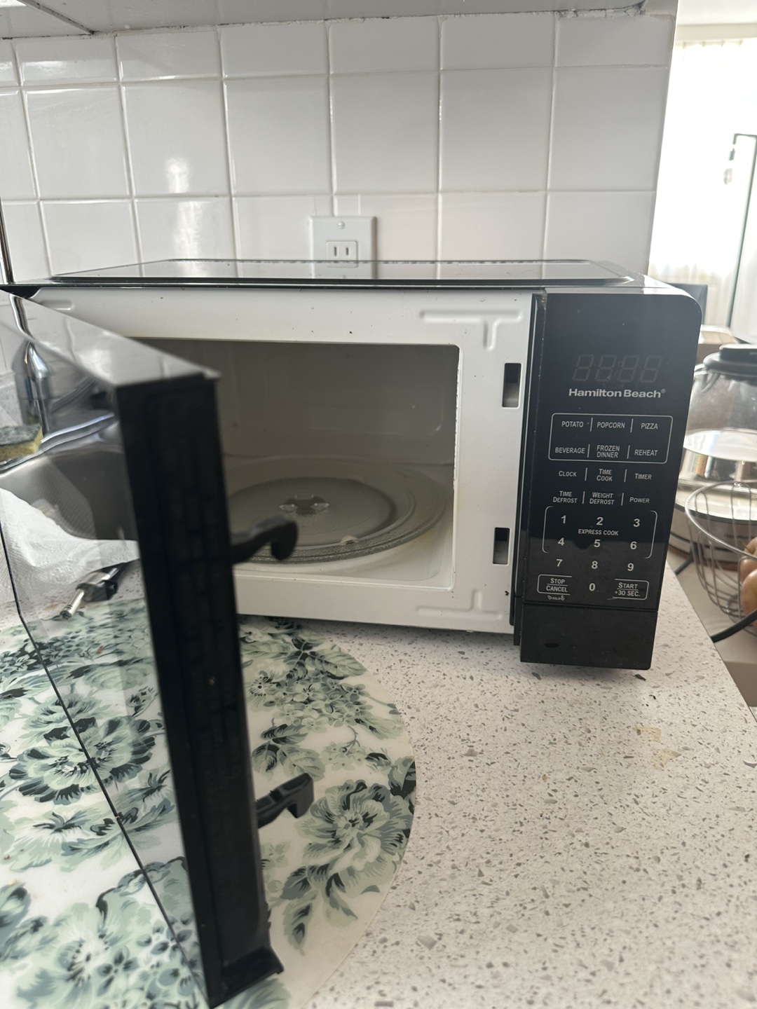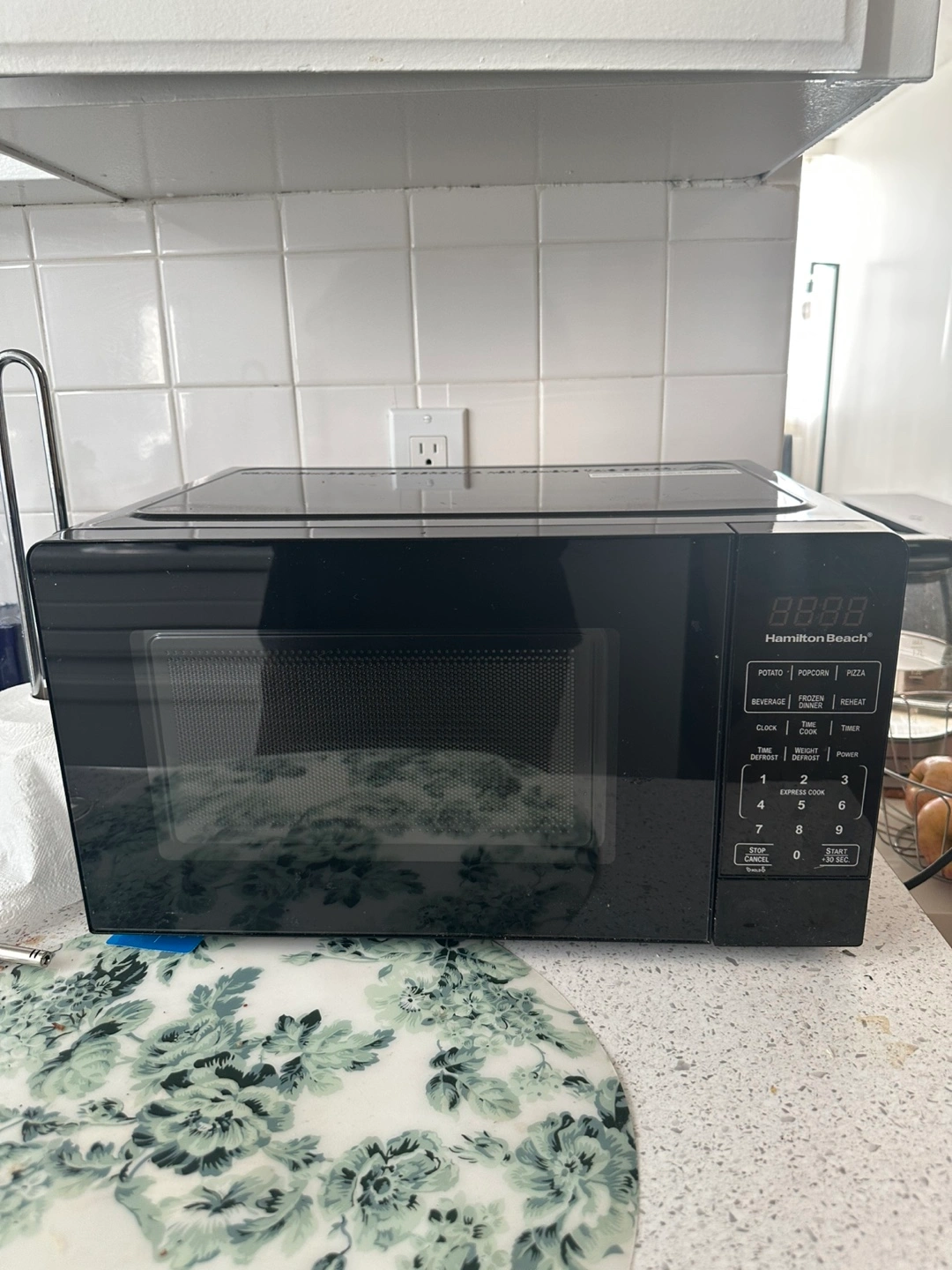 Hamilton Beach microwave in black. It's in great shape and ready for a new home! Perfect for reheating leftovers or cooking a quick meal.