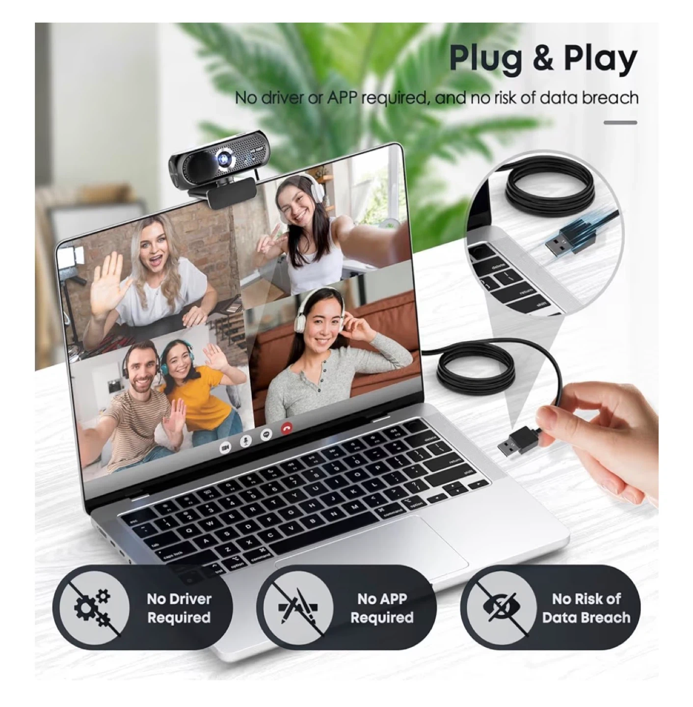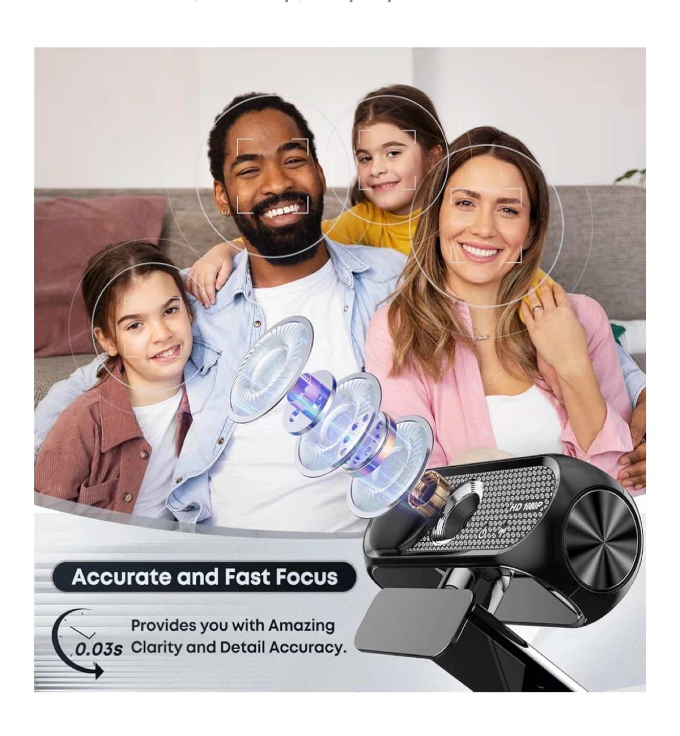 This webcam offers 1920 x 1080 resolution for smoother video. It's plug and play, requiring no driver or app. Features accurate and fast focus with 0.03s clarity.