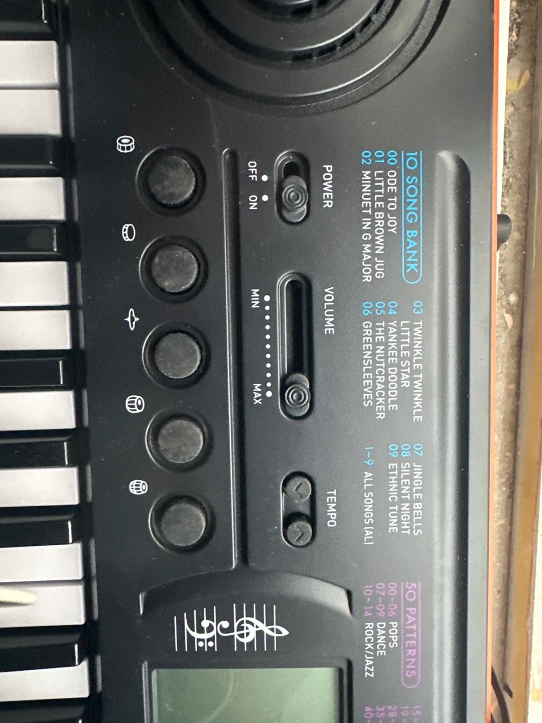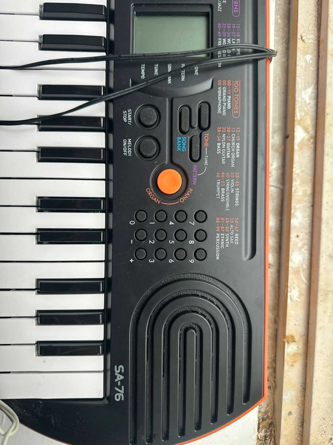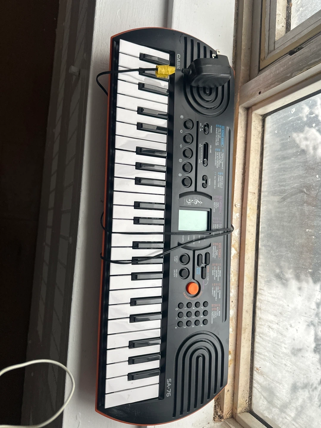 Casio SA-76 portable keyboard with 44 keys. It has 100 tones and 50 patterns. Includes original power adapter.