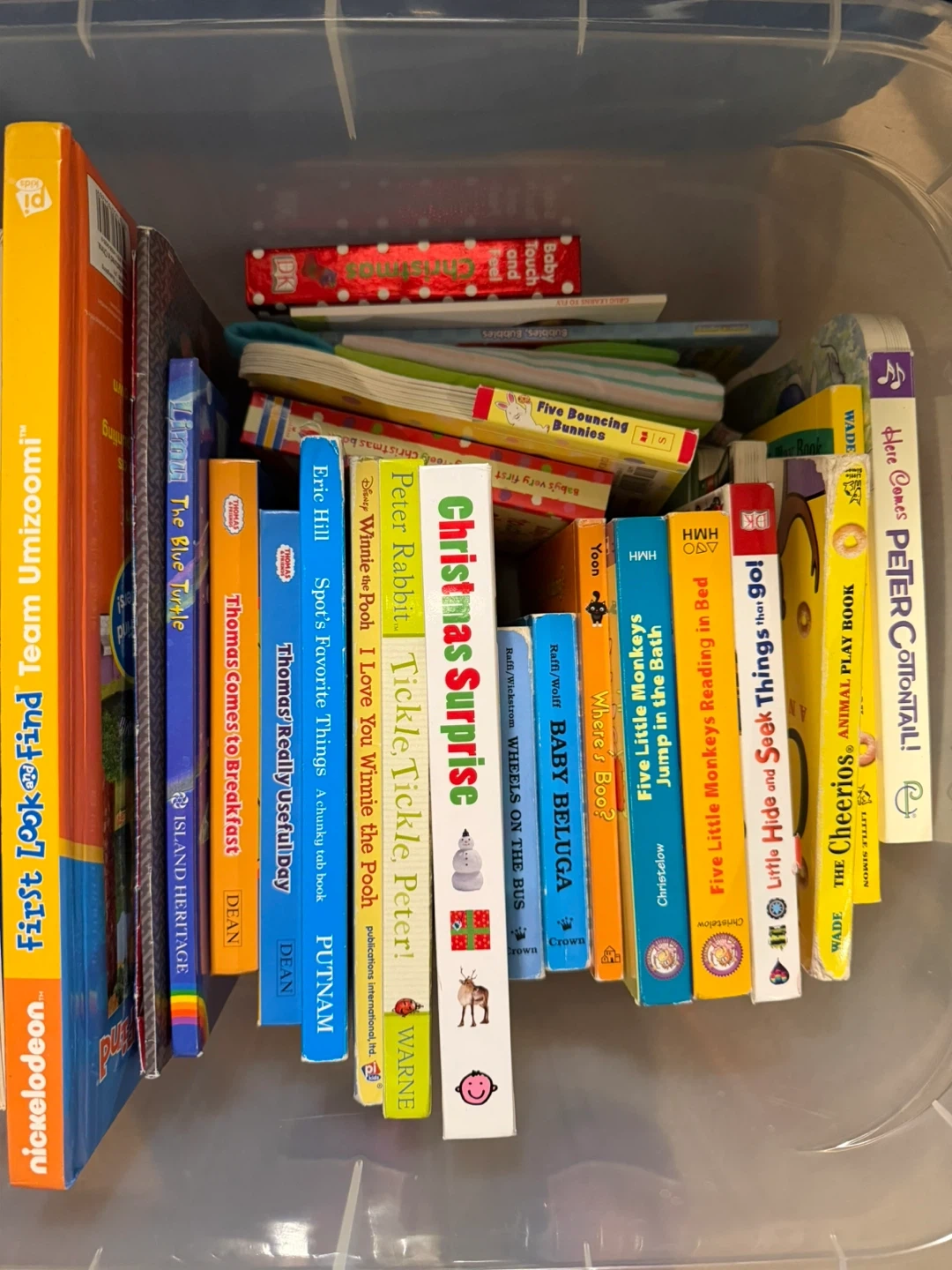A collection of children's board books and tab books, including titles like Team Umizoomi, Thomas the Tank Engine, Winnie the Pooh, and Peter Rabbit. These are great for little ones learning to read. Lots of fun stories in this batch!