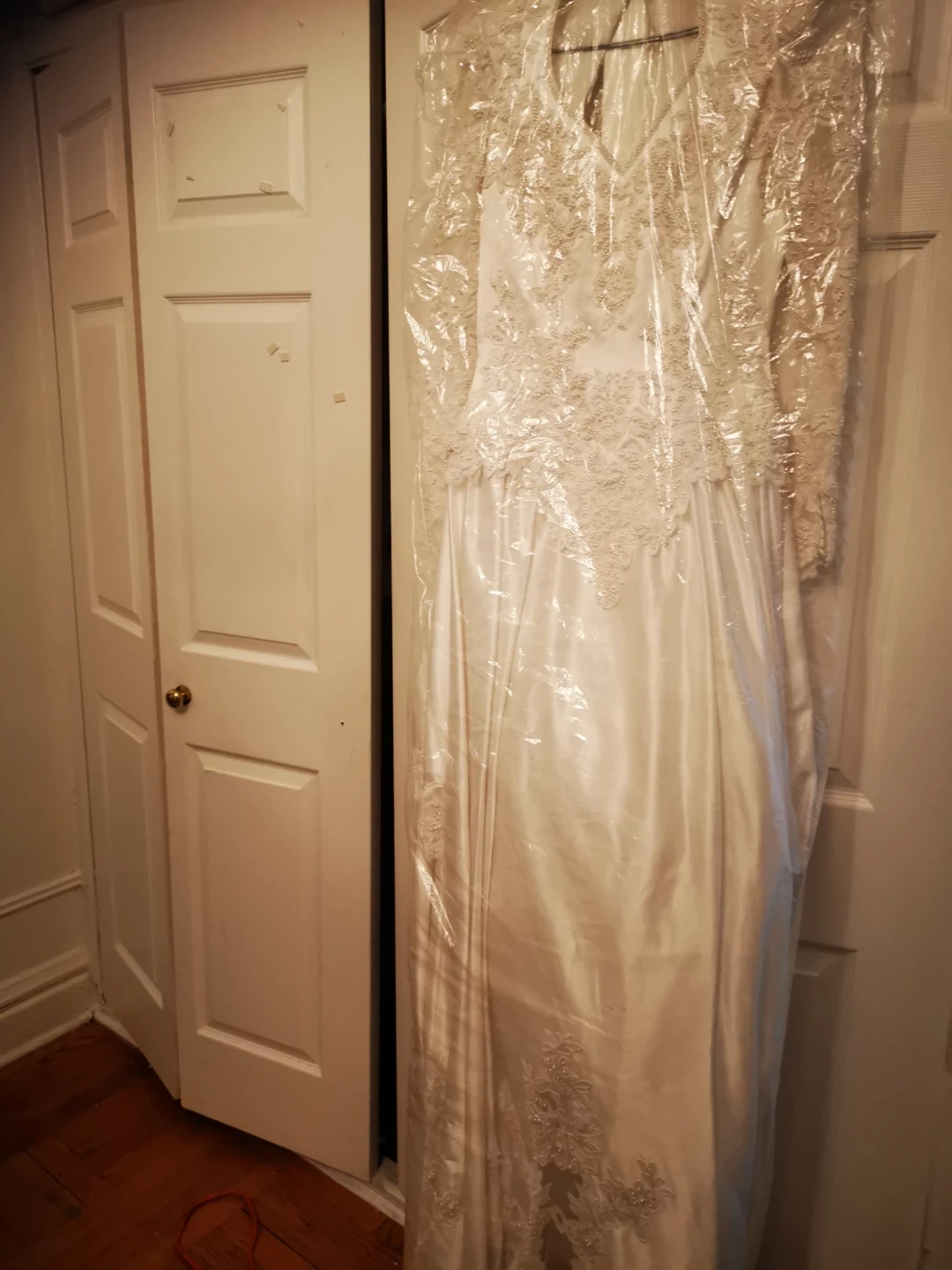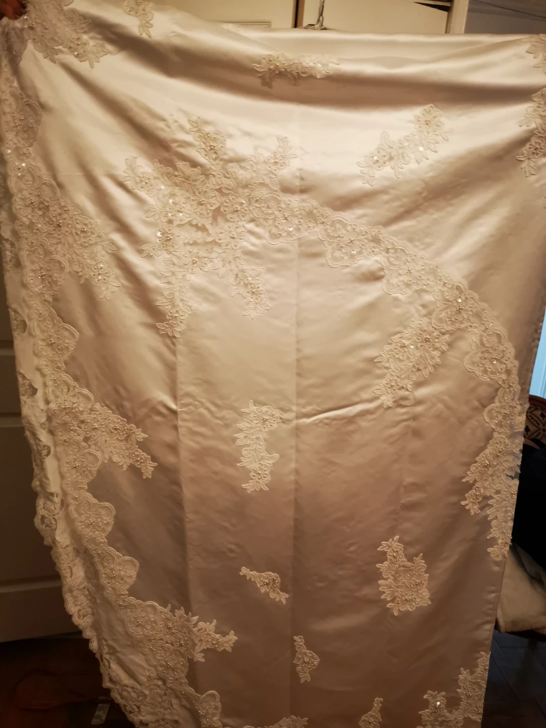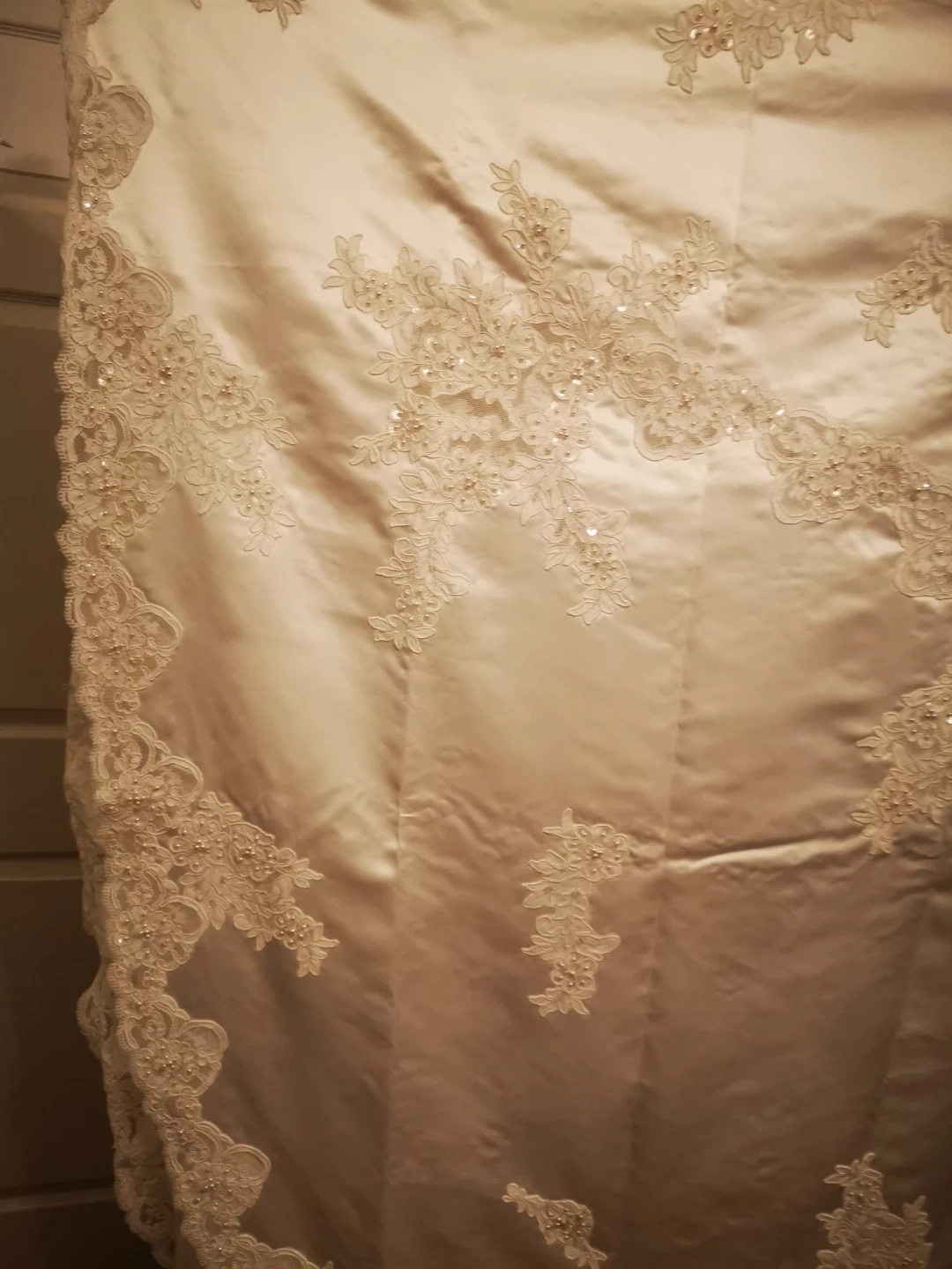 DAVID'S BRIDAL Beautiful wedding dress with delicate lace appliques. It's in great condition and ready for your special day! The dress is white and features intricate detailing.